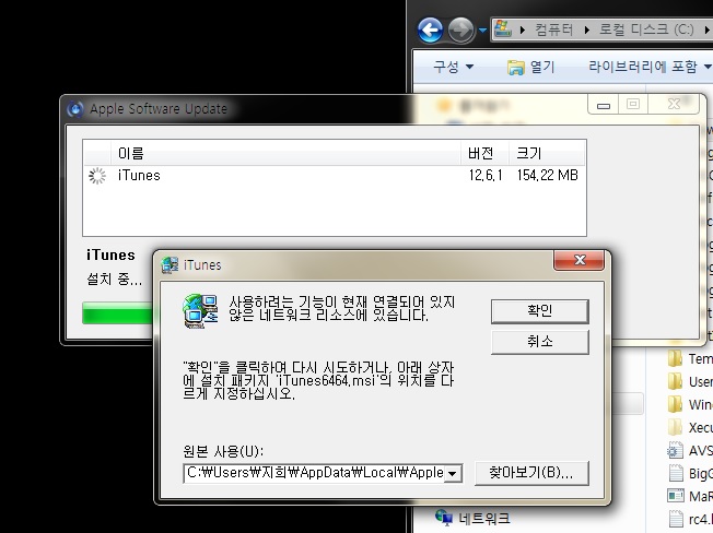 삭제 또는 업데이트,설치기에 자꾸 저런 메세지가 뜨네요.. 그리고 확인 누르면