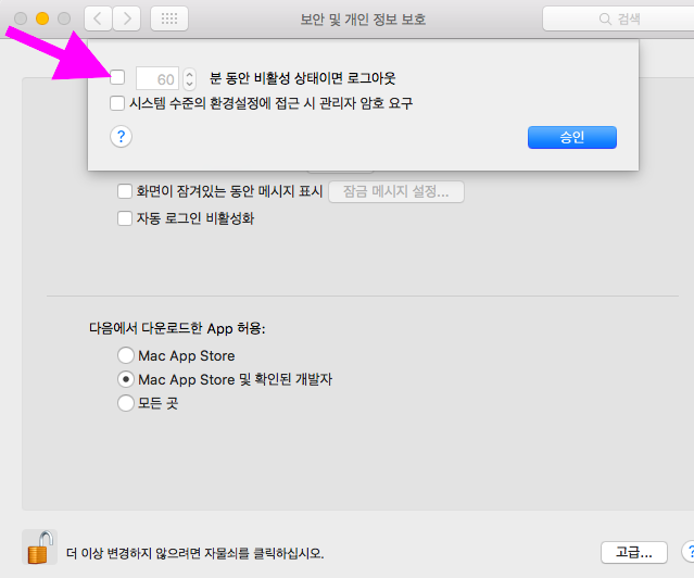 시스템 환경설정 > 보안 및 개인 정보 보호 > 일반 > 고급 > ...분 동안 비활성 상태이면 로그아웃