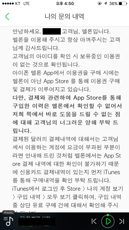 멜론 앱이 아닌 애플 스토어에 앱을 통한 결제는 확인이 되지 않는다고 해서 환불 요청 드립니다