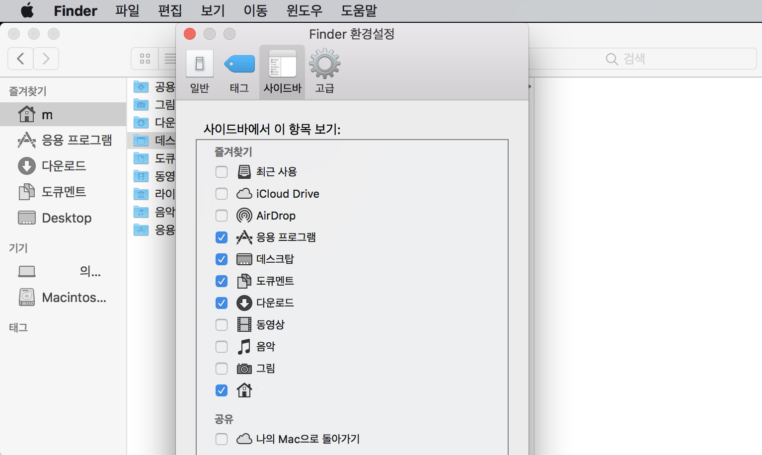 언젠가부터 파인더에서 사이드바에 다운로드, 도큐멘트, 데스크탑이 사라져있길래 사이드바 설정에서