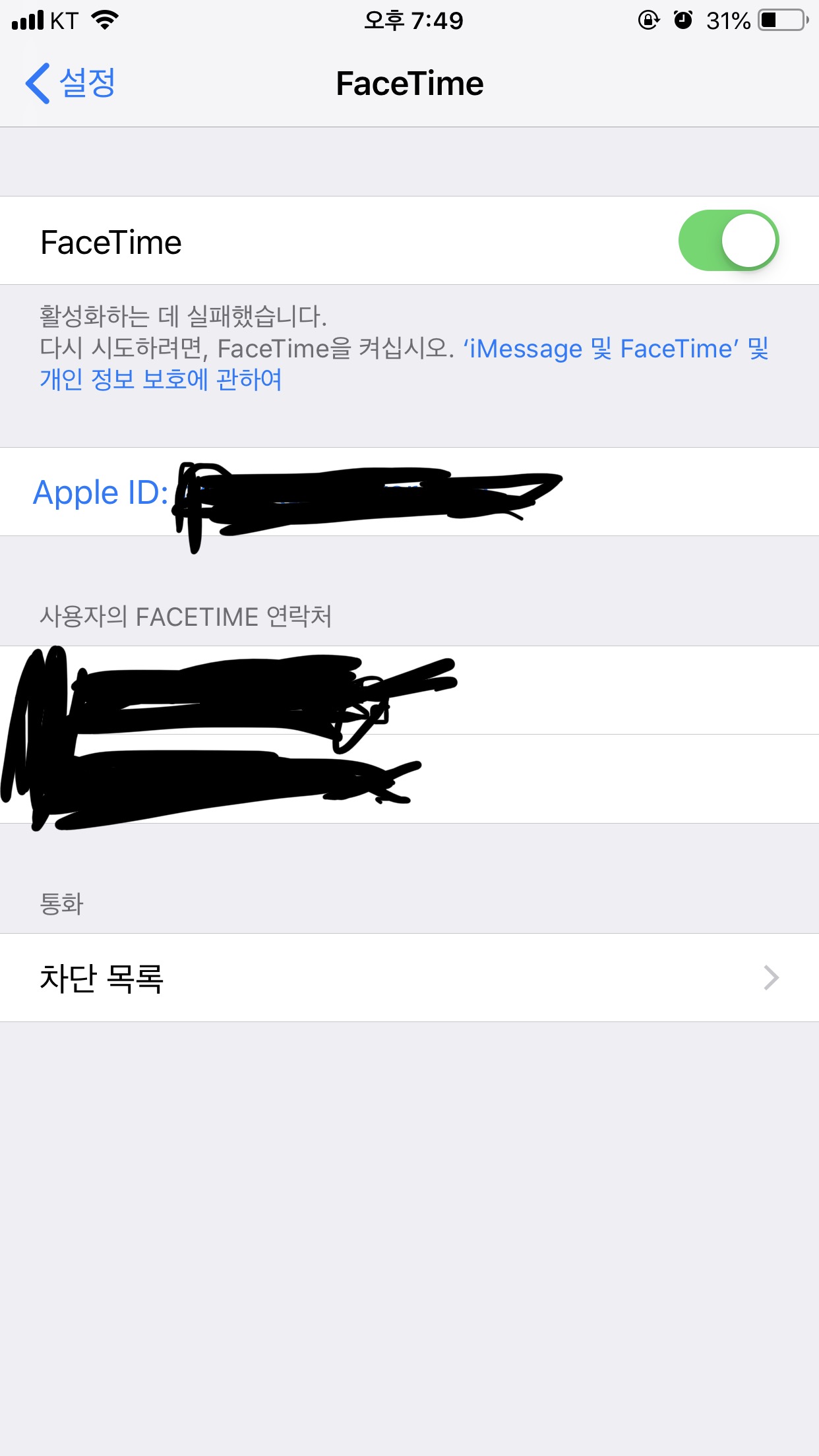 전화 후, iPhone 부서에 연결하여 iMessage, FaceTime 활성화가 되지 않는다는 내용과 Apple ID를 불러주면 해제를 도와주더군요.