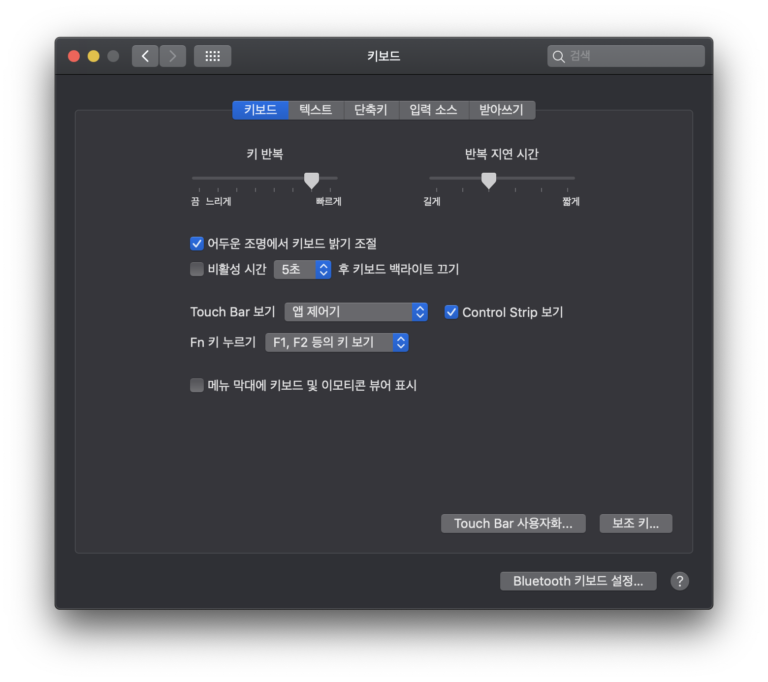 Touch Bar는 키보드 상단의 기능 키를 대체되어 시스템 환경설정 > 키보드 > Fn키 누르기 > F1, F2 등의 키 보기 토글 선택이 가능합니다.