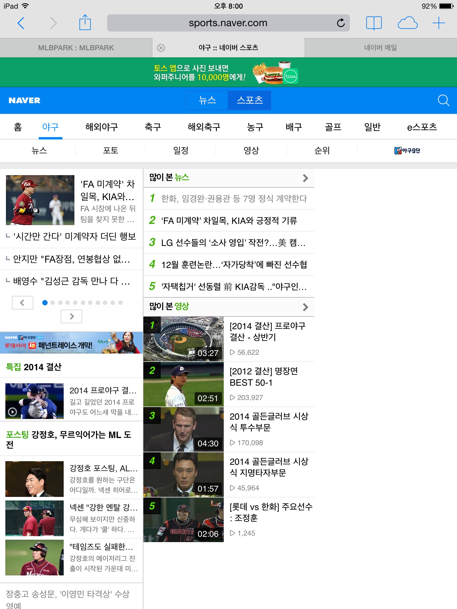 며칠전부터 아이패드로 네이버 모바일의 스포츠>야구 화면이 이상하게 나옵니다.