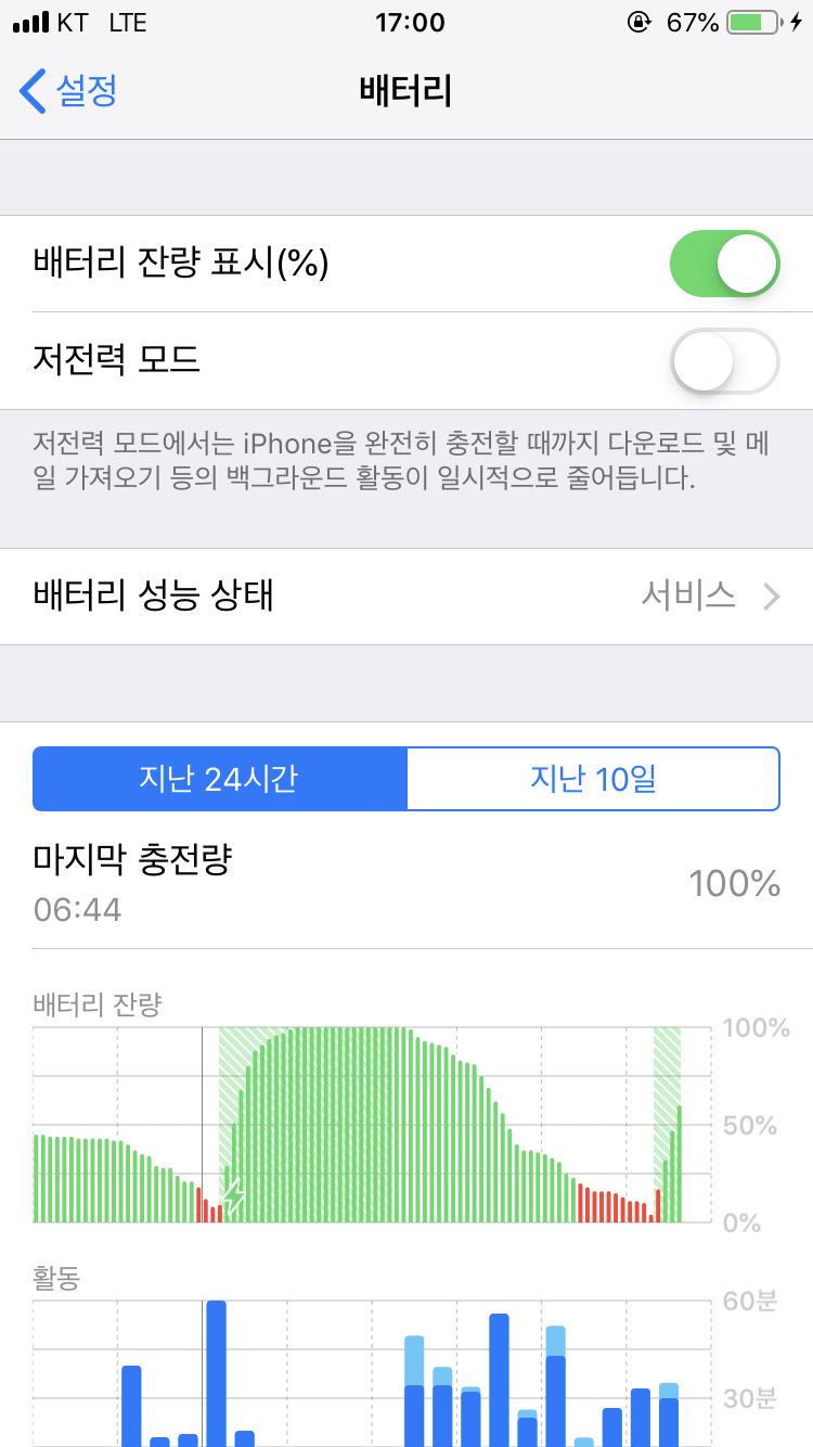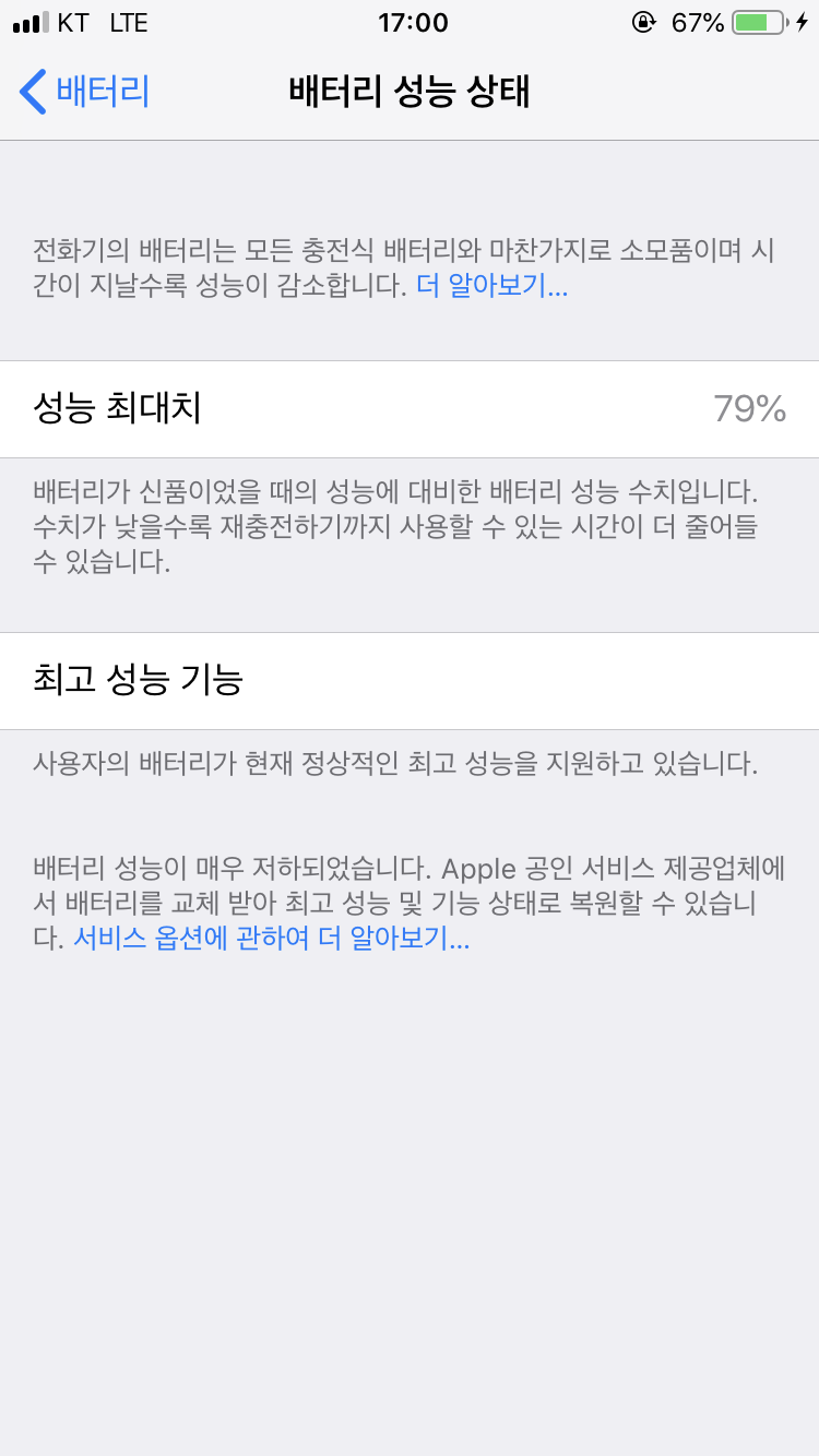 하지만 한편으로는 ‘배터리 성능이 매우 저하되었습니다’ 라는 문구도 보입니다. 짧은 시간에 급격한 소모가 있었기 때문이 아닐까 싶어요.