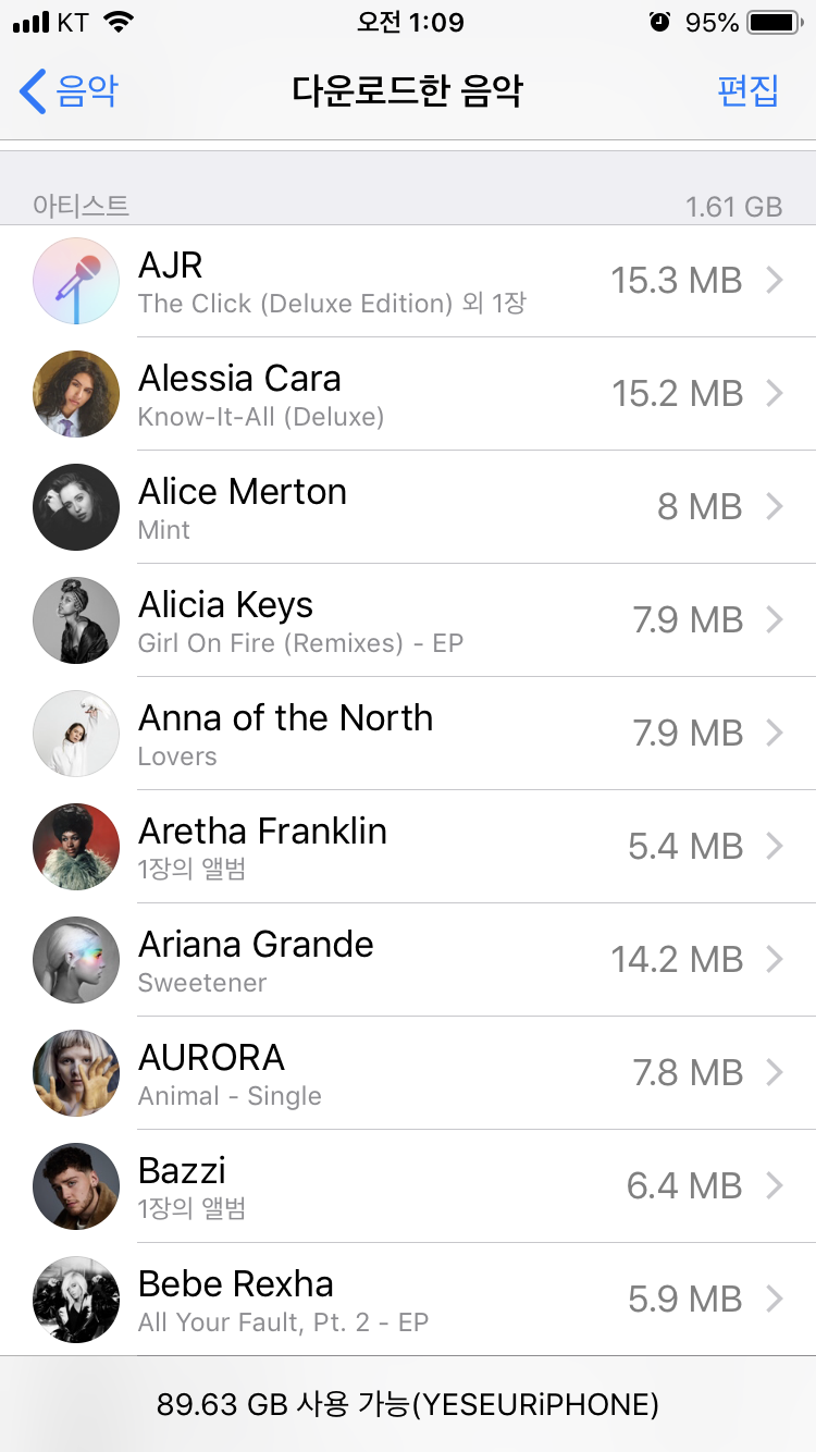 이 노래들 다 받은 적 없고 플레이리스트에도 없는데 설정-애플뮤직 들어가서 노래 좀 삭제하려고 보니까 저렇게 용량 차지하고 있네요 뭐죠??