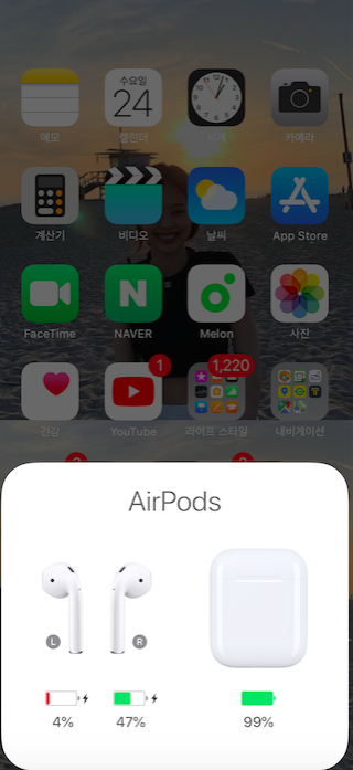 사진과 같이 에어팟의 배터리가 양쪽이 다르게 닳는 증상이 종종 발생합니다. 따로 따로 착용하지 않고 같이 사용하고 같이 충전시켰는데 양쪽 배터리 잔량이 다르게 나타납니다.