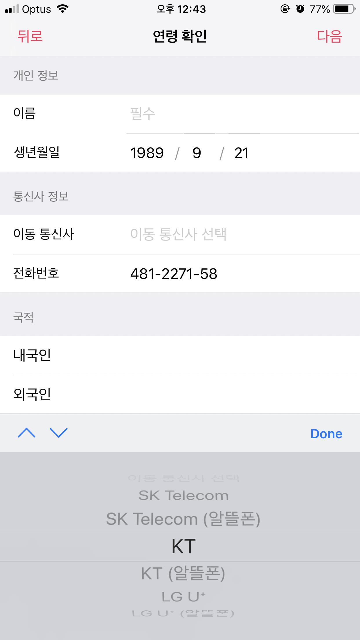 통신사 선택이 한국꺼만가능하니 연령확인을 못해여여다른 방법 없나요?
