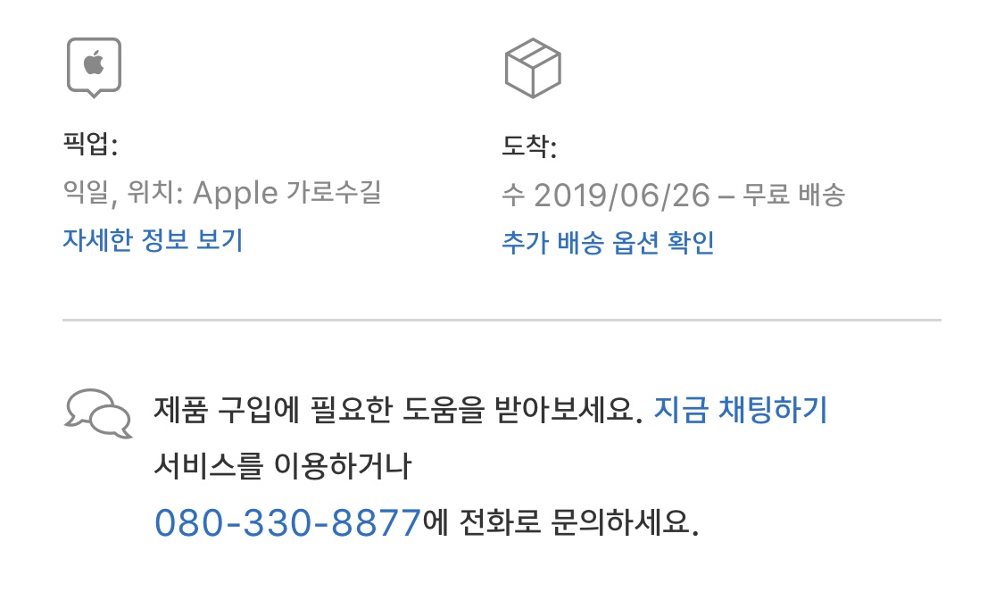 하단에 배송 관련 구체적인 정보를 확인 할 수 있으며, 앞 답변처럼 080-330-8877에 문의해서 확인이 가능합니다 정말 급하시다면 애플 가로수길 또는 일반 애플 리셀러 매장에서 구매하시는 것도 추천드립니다