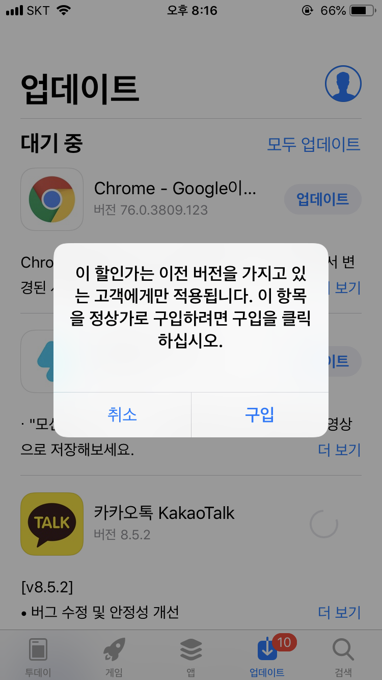 어플 업데이트를 할려고 업데이트 버튼을 눌렀는데 저렇게 자꾸 뜨는데 어떻게 해야되나요 핸드폰 껐다가 켜 보고 해봤는데도 안됩니다 구매를 눌르면 저 메세지만 자꾸 뜹니다