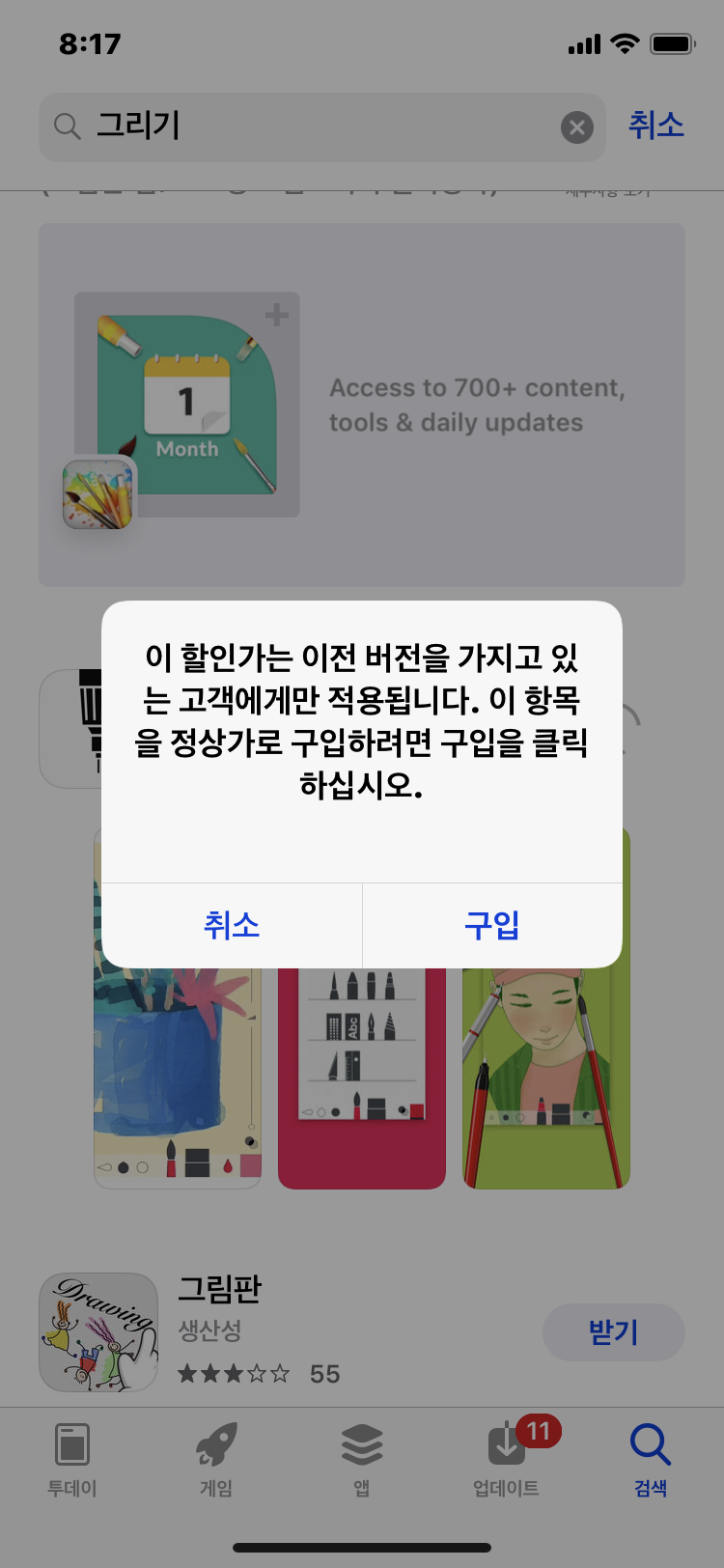재 설치로 잘 되는게 맞다면 앱 스토어 계정을 중간에 바꿨을경우 현재 계정으로 연동이 안 되서 나타날 수 있습니다