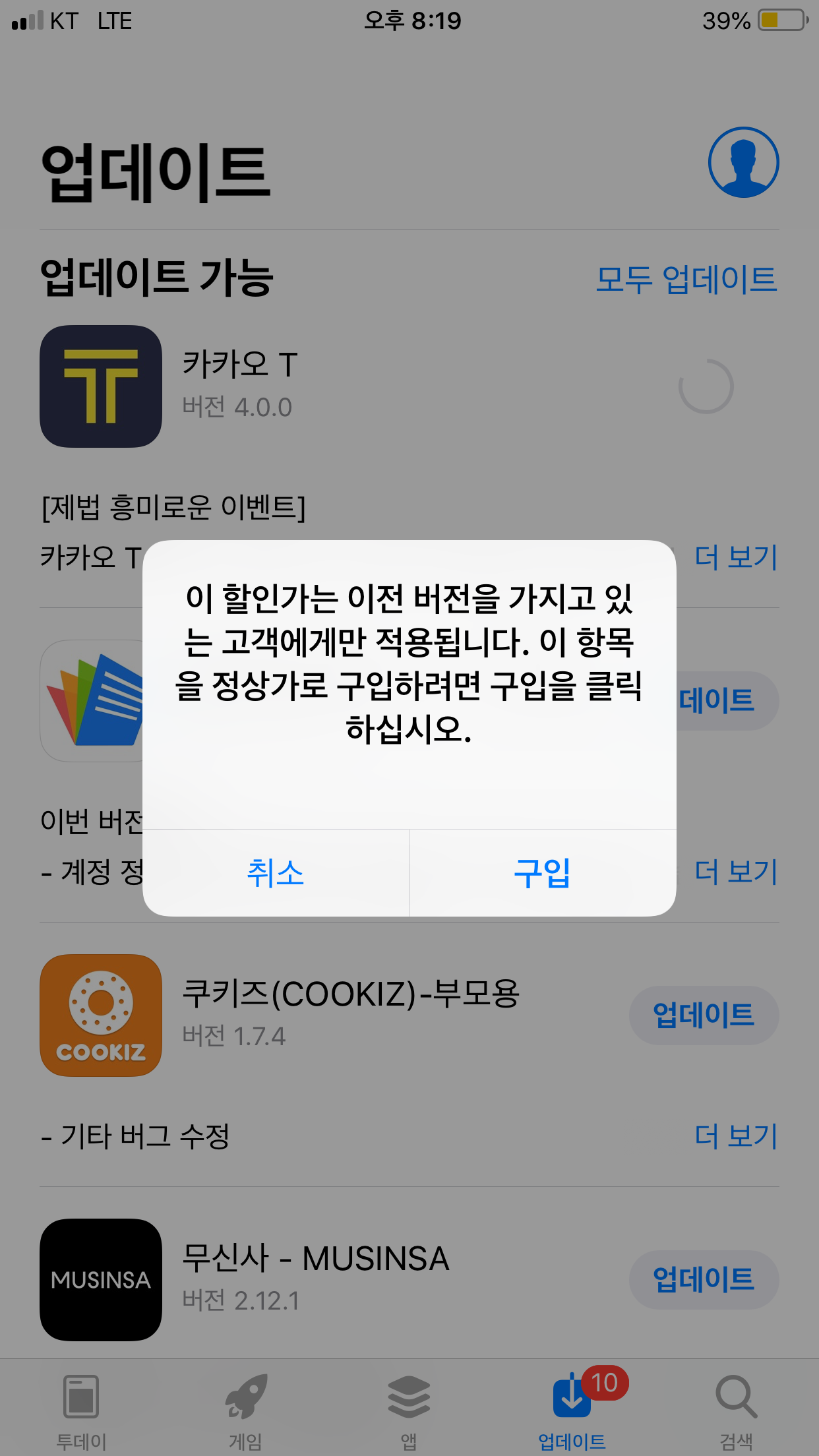 앱 스토어 계정을 중간에 바꿨었다면 발생할 수 있고 제거 후 재 설치하면 현재 계정으로 연동되서 해결됩니다