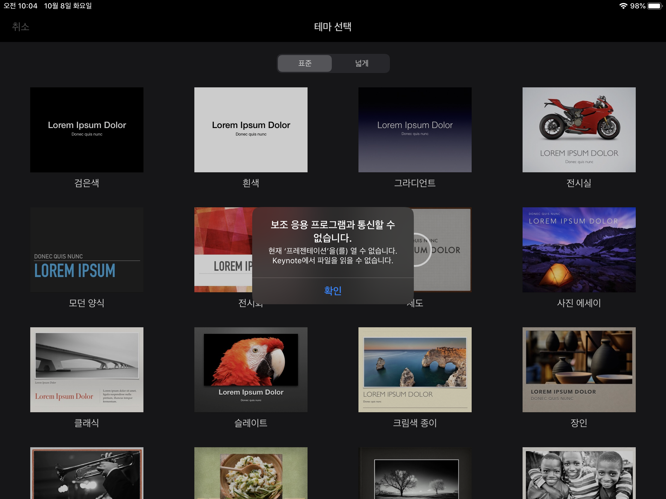 키노트 테마 선택 후 "보조응용프로그램과 통신할 수 없습니다" 메세지..