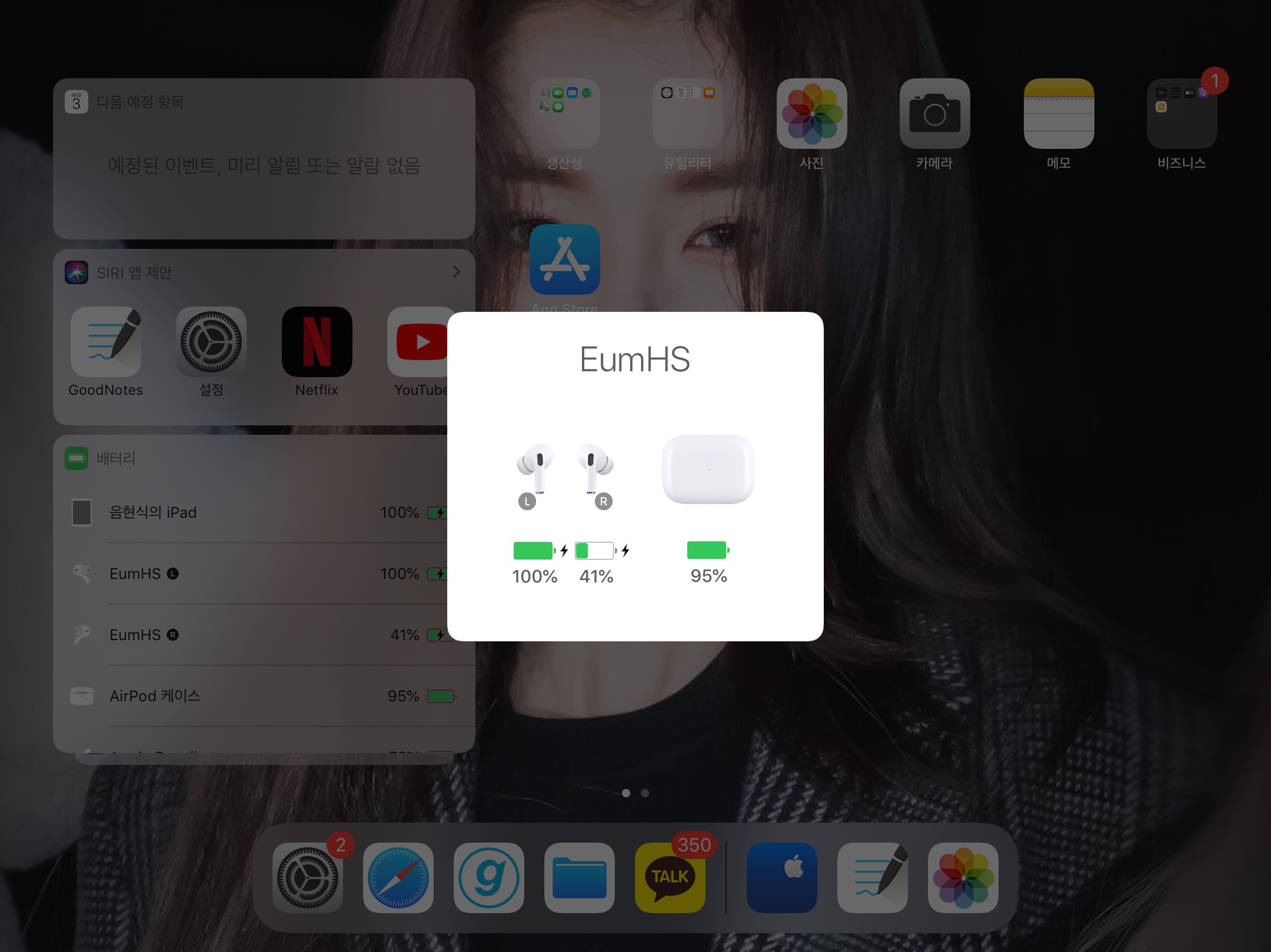 2. 일단 자고 일어나서 한쪽 유닛이 40% 인채로 빼봤습니다 양쪽유닛 으로 노래를 들으면 왼쪽만 배터리가 달고 오른쪽 유닛은 40%로 유지가 됬습니다