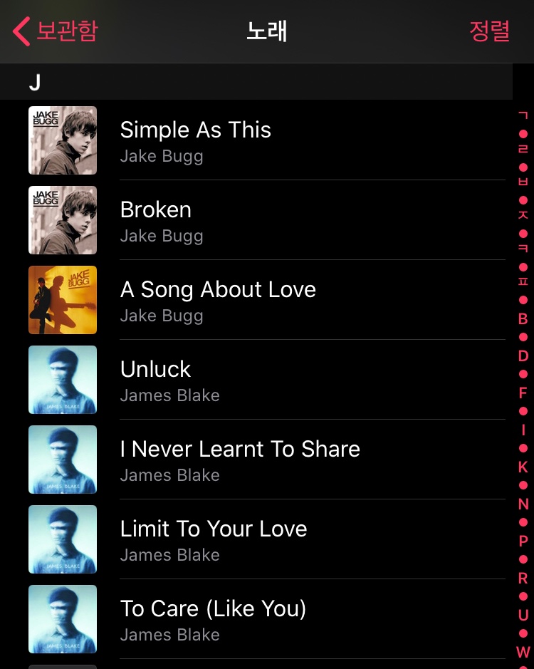 아이폰에서는 다음과 같이 전체 곡을 아티스트 이름 순으로 정렬할 수 있습니다. 늘 이런 방식으로 노래를 찾아 들어서 애플워치에서도 같은 방식으로 전체 곡을 정렬하고 싶은데 곡 이름으로만 정렬이 되네요. 혹시 아티스트 이름 순으로 정렬하는 방법이 있나요?