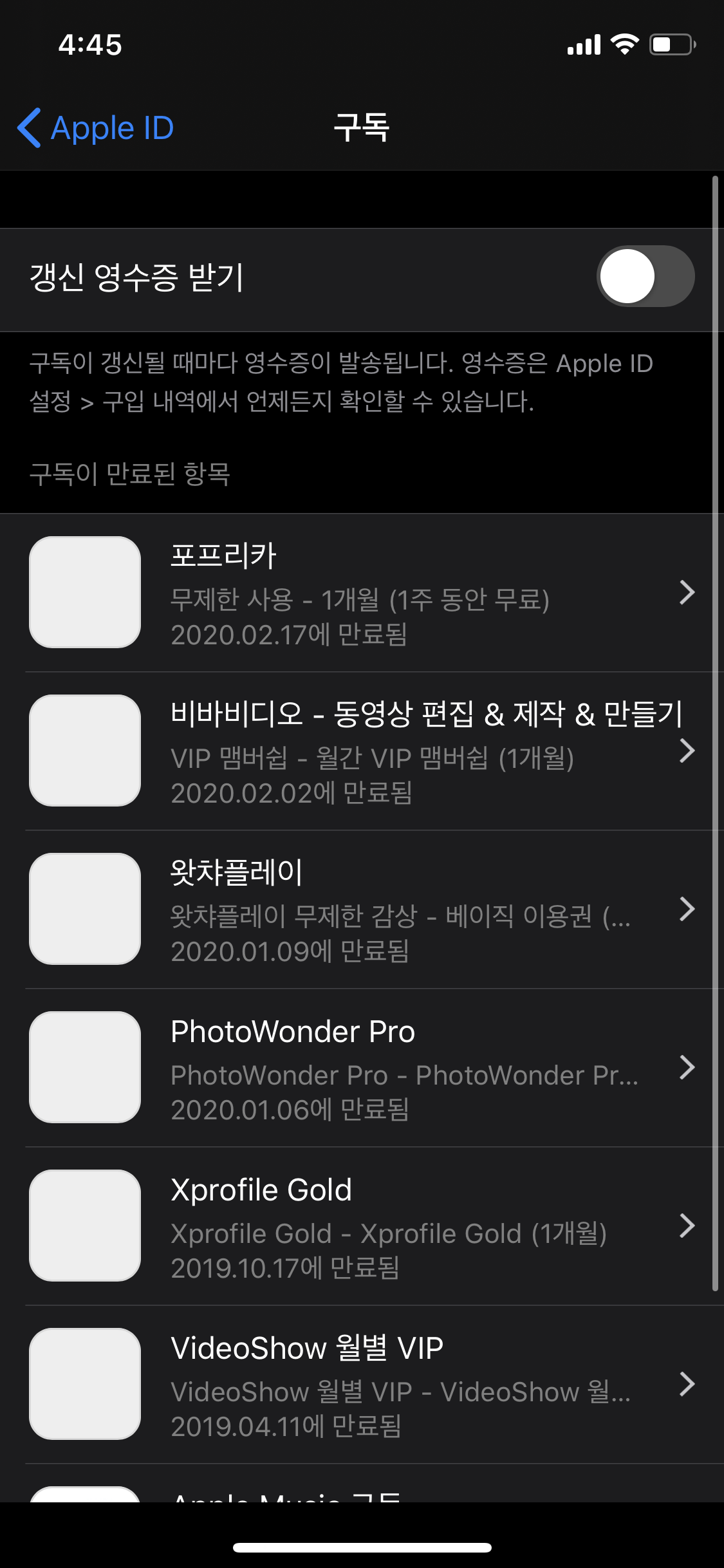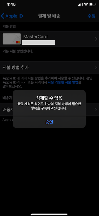 기존에 지불하던 카드를 삭제하려고 하는데 자꾸 저렇게 나오네요. 그래서 구독 목록에 들어가보니 다 만료되어 있어요.