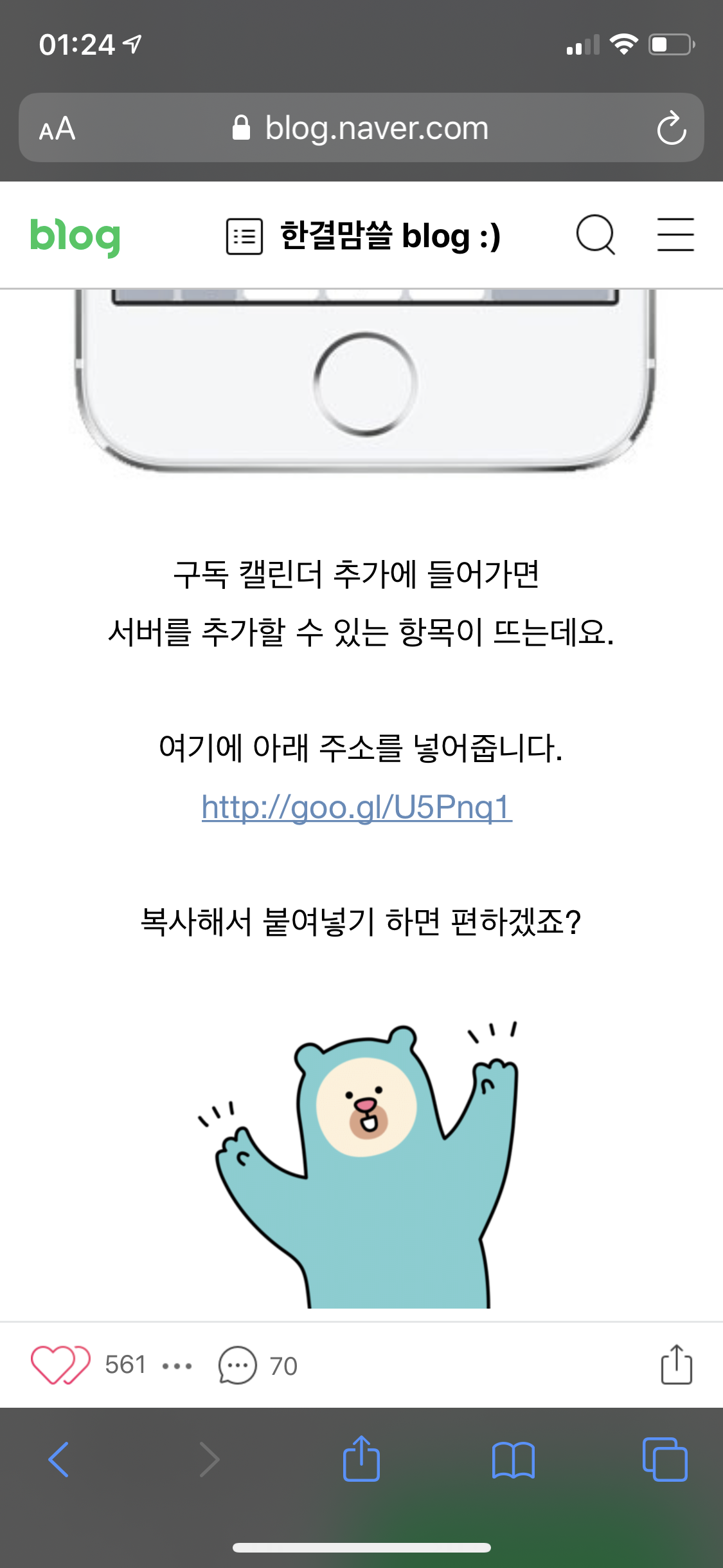 인터넷에서 “아이폰 음력달력 추가” 검색후에 보이는 블로그에서 하라는 대로 하다가 맨 첫번째 주소를 복사해야하는데 클릭해버린후 바로 구독 이 눌러져서 2,3번째 사진처럼 절기와 음력이 부분부분 입력 되었습니다. 가족동기화로 입력됨