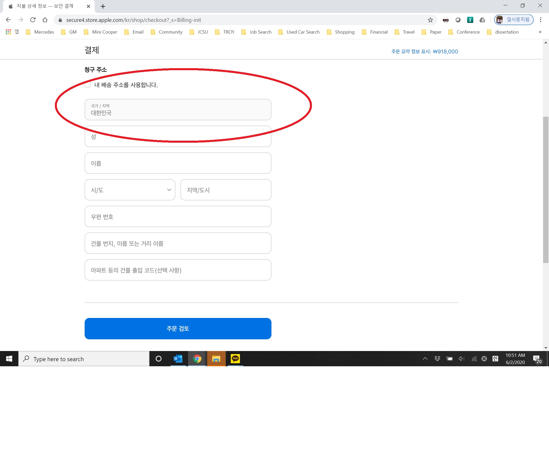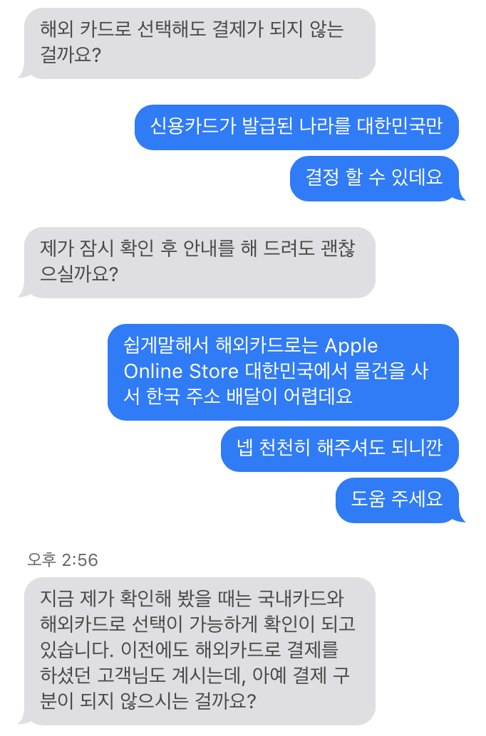 다시 말해 해외 카드로는 Apple Korea에서 물건을 사서 한국 국내 주소로 배달이 불가능하네요.