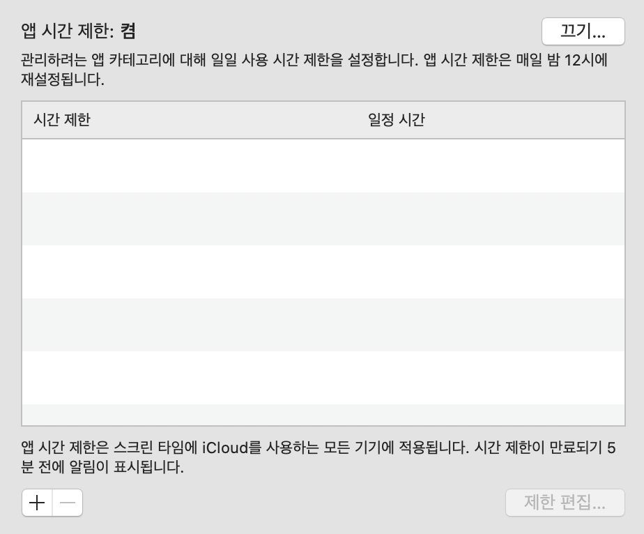 시스템 환경 설정 > 스크린 타임 > App 시간 제한 > 켬 여부 및 하단에 추가된 App이 있는지 확인할 수 있습니다.