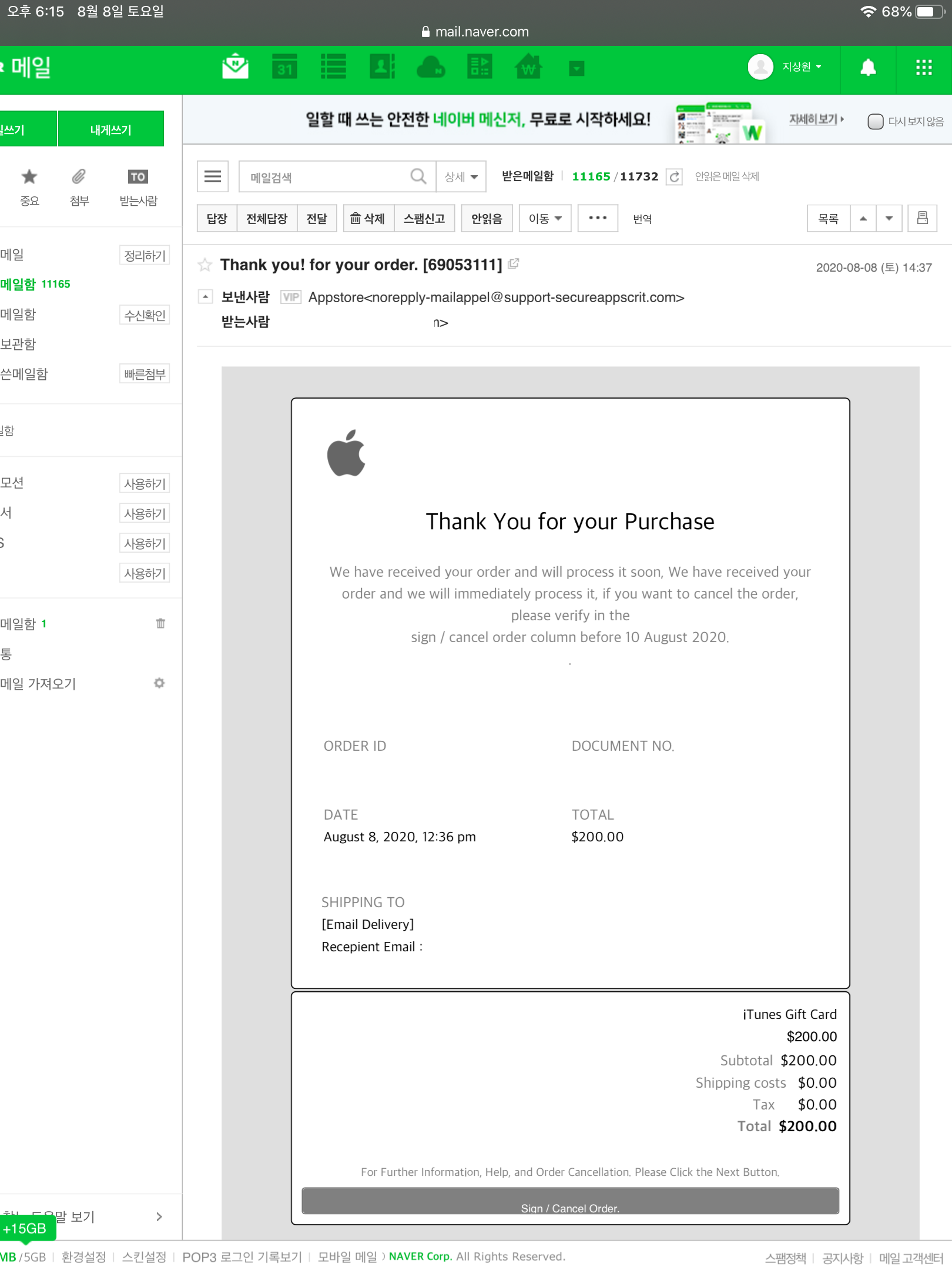 해당 메일은 피싱 메일입니다. 해당 메일 발신자의 도메인이 apple.com이 아닌 것으로 봐서 알 수 있습니다. 다음을 참고해 의심스러운 이메일을 식별하고 Apple에 신고해 주세요.