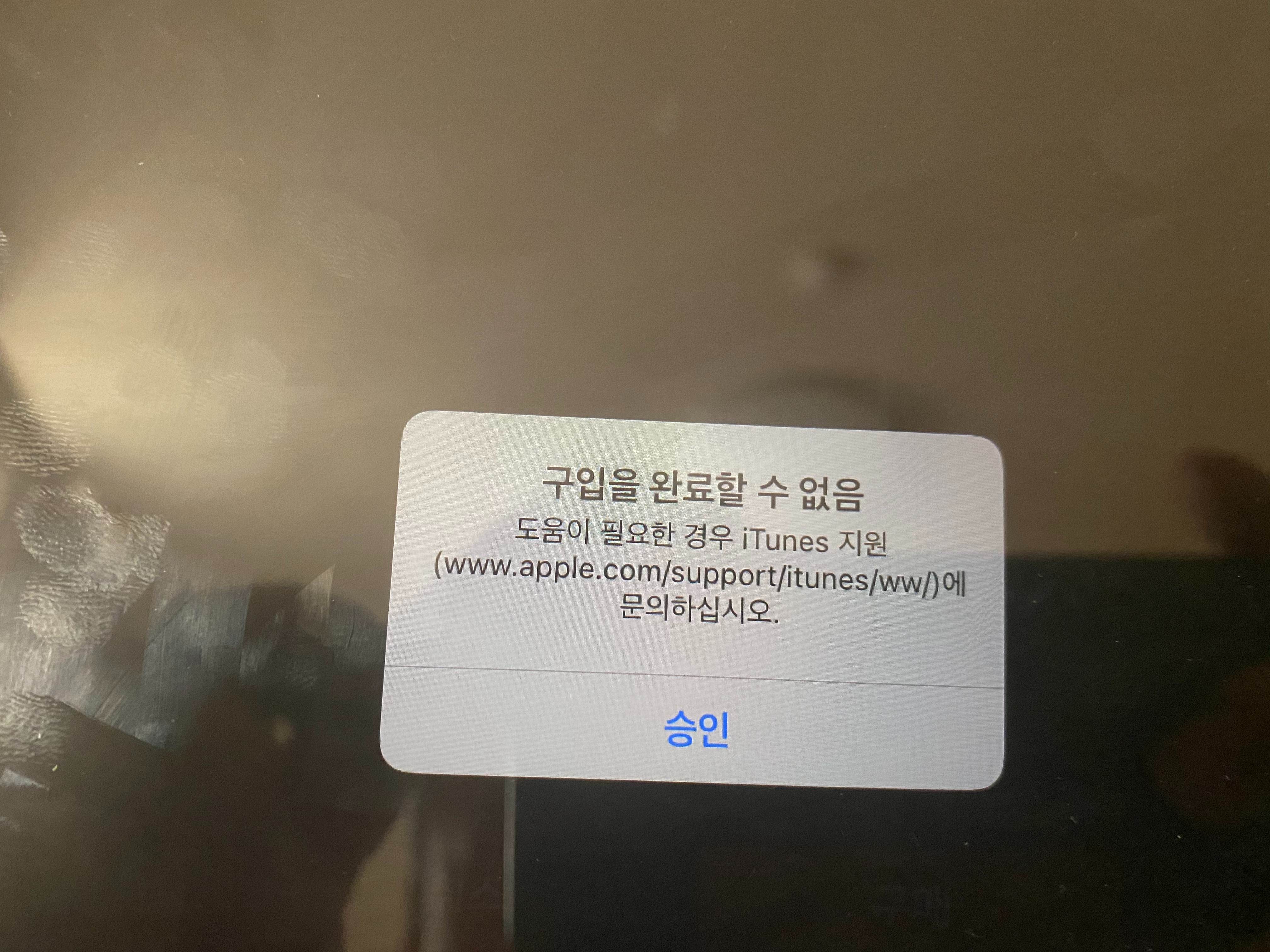 "구입을 완료할 수 없음" 또는 "iTunes지원으로 문의"하라는 에러 메세지가 뜨면서 결제가 되지 않을 경우,
