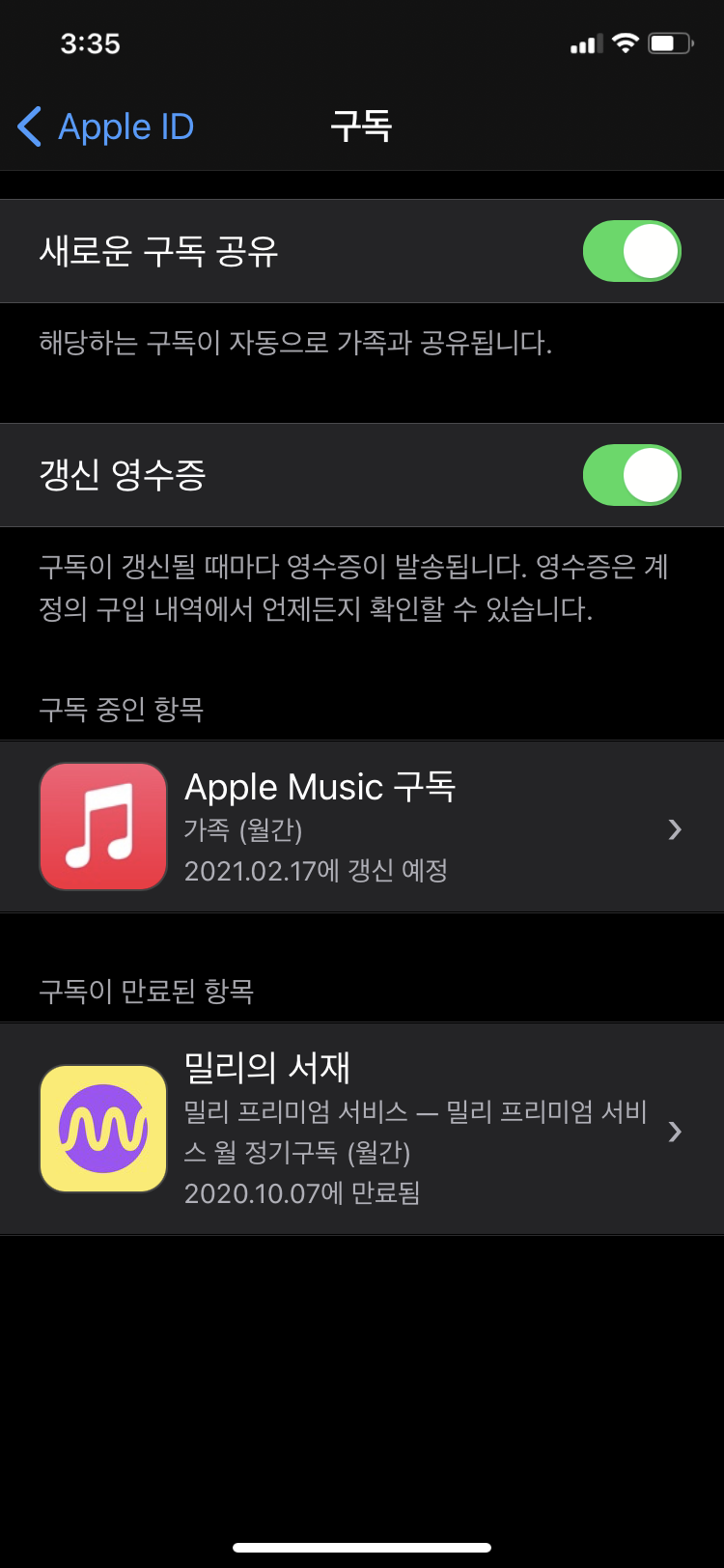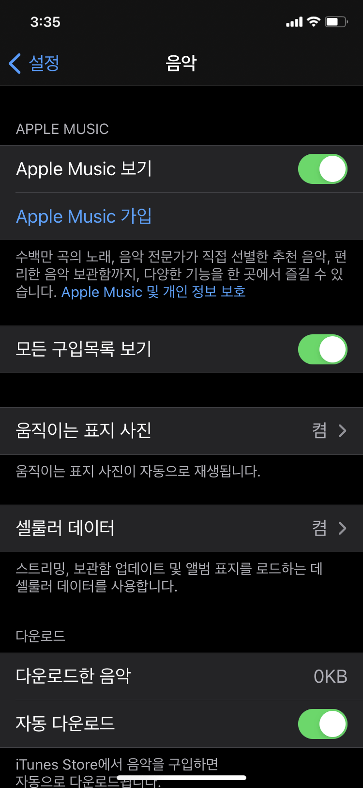 아이폰 구독에는 애플뮤직이 뜨지만 앱 설정 내에서는 구독하라는 바튼이 나오고 앱 내에서 구독이 안 됨. 맥북 아이튠즈에서는 문제 없이 음악을 듣고 있음