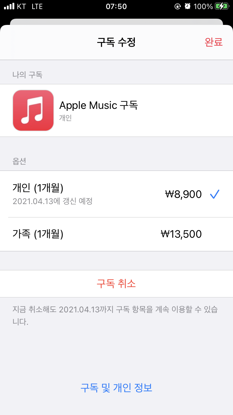 하지만 애플뮤직으로 들어가서 내 구독 관리에서 보니 무료체험이 2달 뒤인 2021-4-13일에 종료된다고 나와서 혼란스럽습니다.