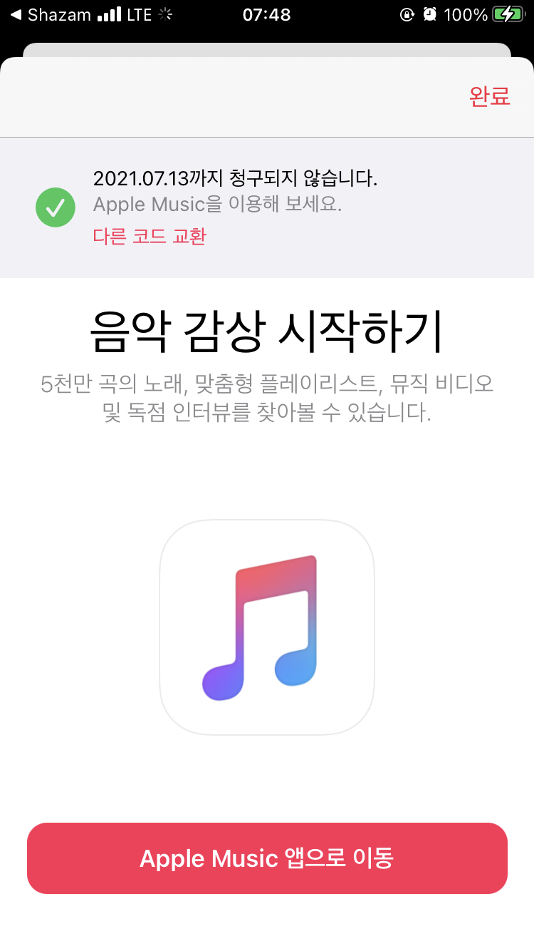 샤잠 앱을 첫 이용하면 애플뮤직을 5개월간 무료체험이 가능하다해서 신청을 했고 (애플뮤직도 아직 한번도 이용한적 없음) 신청완료 화면 또한 2021-7-13일에 종료된다고 캡처한 화면처럼 나왔었습니다.