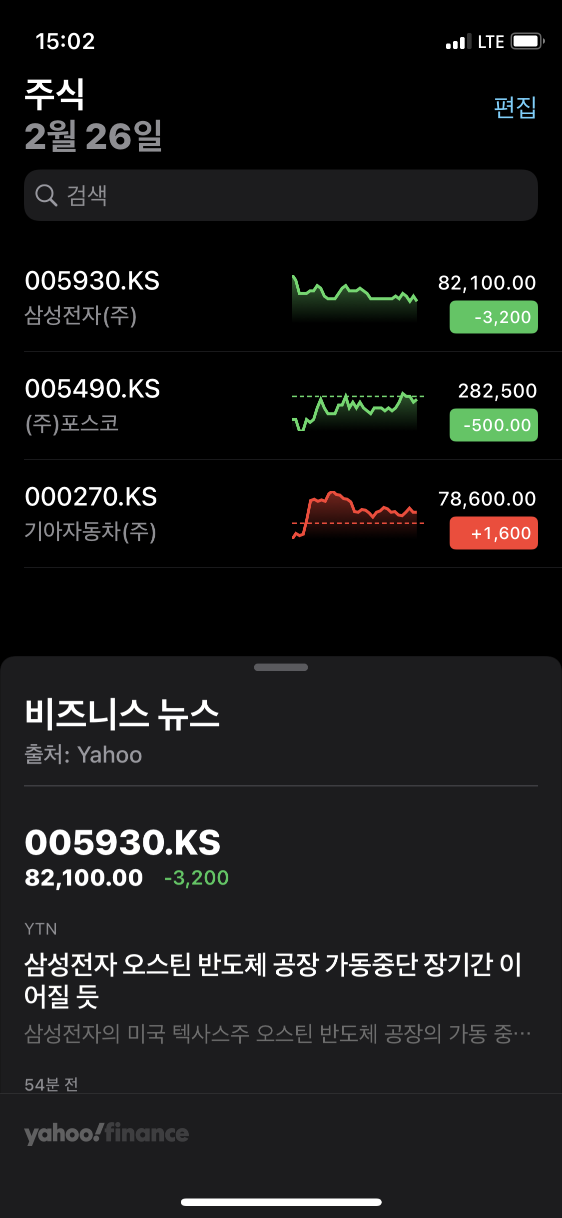 4. 주식 앱에서 ^KOSPI 탭이 제거 되는지 확인합니다.
