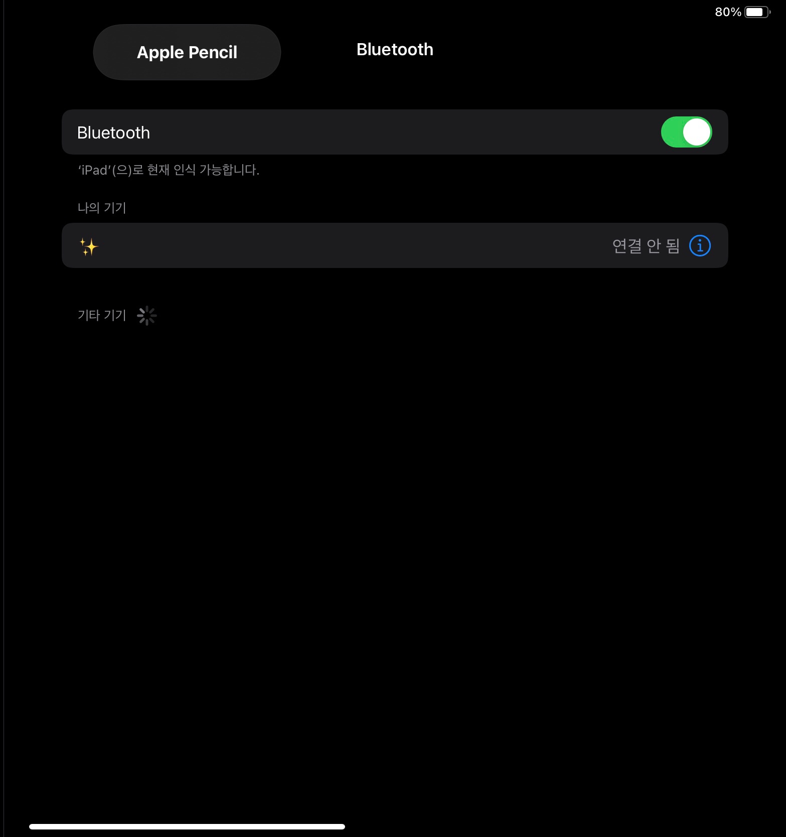 어제 펜슬을 쓰고 있는데 갑자기̆̎ 끊기면서 아예 필기가 되지 않았습니다. 옆에 붙여서 페어링을 시켜봤더니 인식은 하는데 충전중 표시가 뜨지 않았습니다. 그냥 그러려니 했는데 그렇게 해도 다시 작동이̊̈ 안되길래 블루투스에서 삭제하고 다시 해보았으나 붙여 놨는데도 쌍으로 연결 실패가 떴습니다. 그러다 한 수십분 후 다시 연결되고.. 어제는 그려려니 했는데 오늘 또 그러니까 좀 그렇네요.. 애플 펜슬은 거의 90%이상 충전된 상태 였습니다.