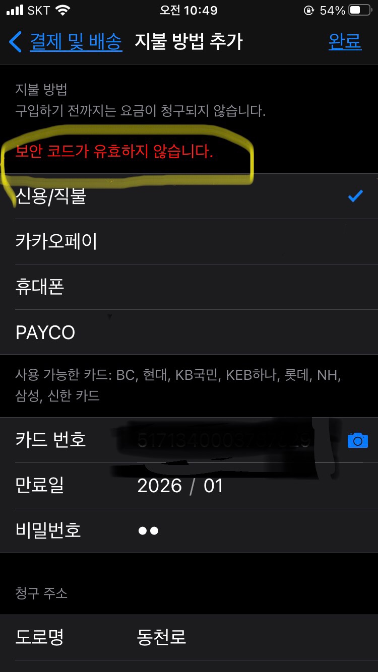 - 보안코드 오류로 등록이 안됨. cvv 입력 창이 없는데 오류창 뜸