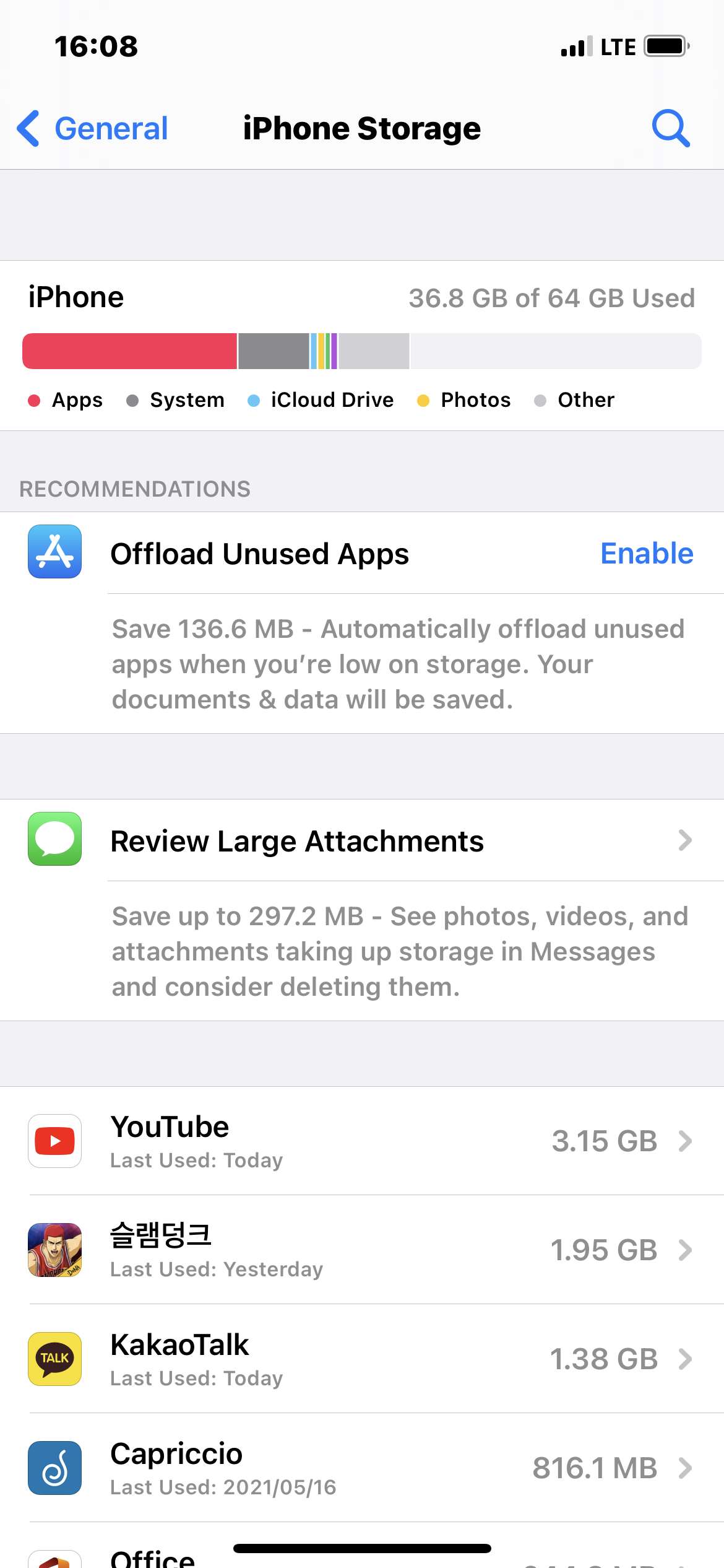아이폰의 저장공간관리 메뉴에서 보여지는 저장공간과 파일앱 , 유튜브 , 유튜브 뮤직등의 실시간 사용가능공간이 차이가 있으셔서