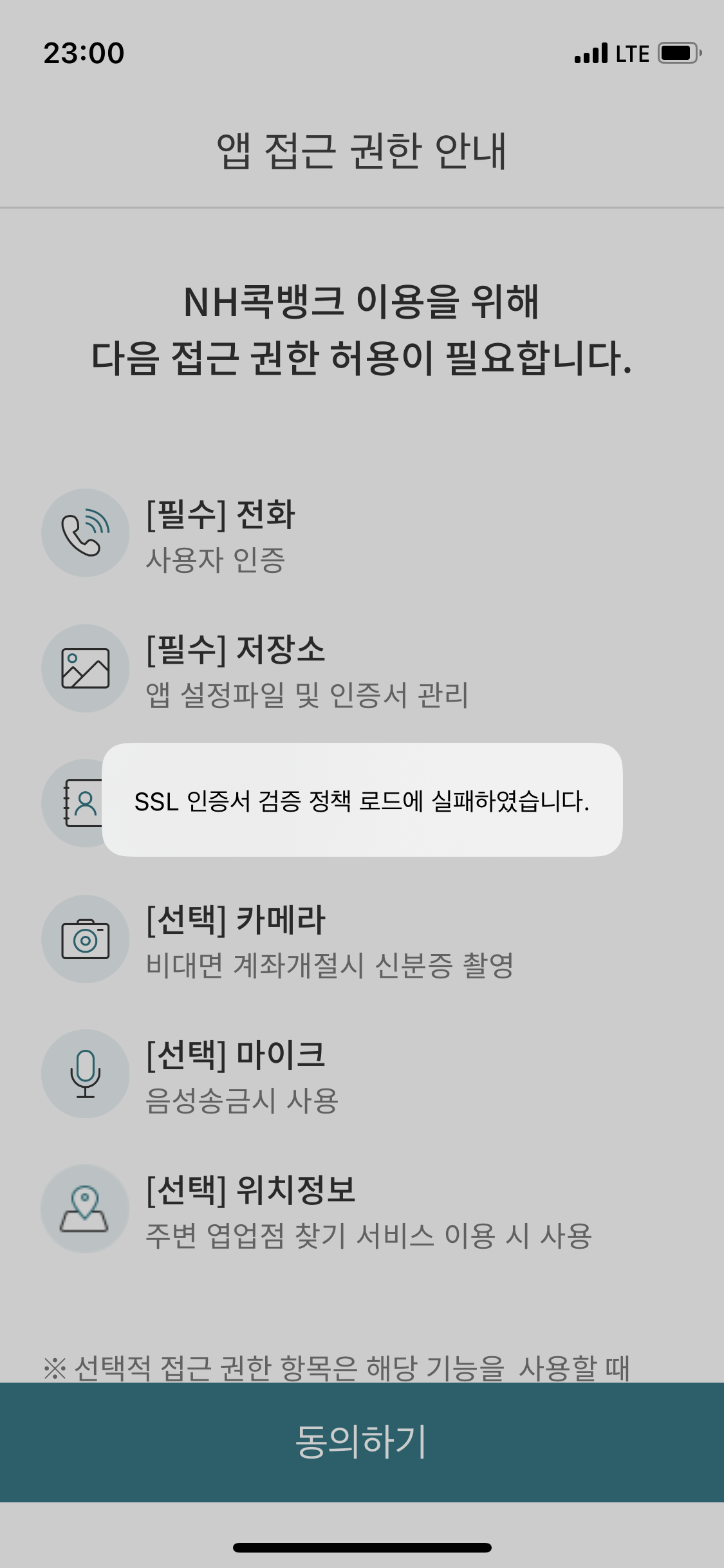 은행 어플(올원뱅크, NH 콕뱅크) 실행시 'SSL인증서 검증 정책 로드에 실패하였습니다' 라는 문구가 뜨며 자동으로 앱이 종료됨