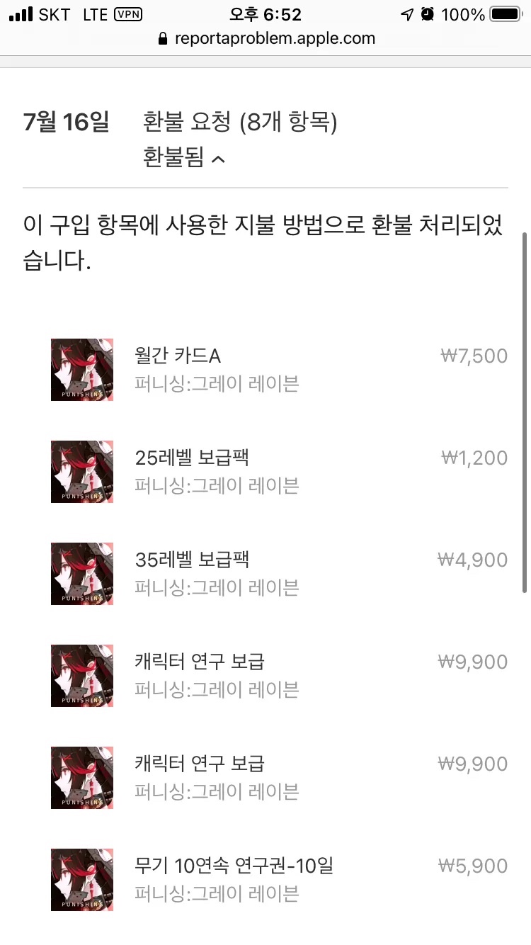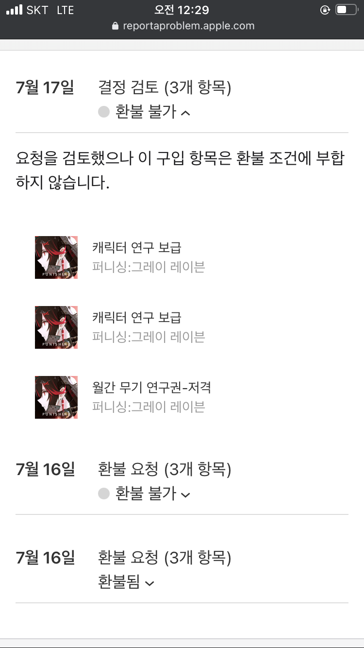 환불을 거절당하였습니다. 퍼니싱 : 그레이 레이븐 이라는 게임에 75,200원을 사용하였고, 해당 게임에 서버 간 가격 차이, 확률 차이 등의 문제가 여럿 있었기에 환불 요청을 하였습니다. 현재 25,400원은 환불에 성공하였으나 나머지는 환불 요청이 거절되었고 재검토에 상세한 이유를 적었는데도 거절되었습니다. 원래는 그러려니 하겠지만, 환불 요청한 해당 게임 커뮤니티를 살펴보면 앱스토어 유저들은 전부 전액 환불에 성공하였습니다(사진 첨부). 위 사진이 저의 환불 요청 목록이며 아래 사진은 해당 게임 커뮤니티에서 본 타인의 환불 요청 사진입니다. 사진에 있는 환불 상품들 또한 저와 대부분 겹칩니다. Apple에서 제가 납득할 수 있는, 환불 요청 거절을 하는 타당한 이유를 알려주셨으면 합니다.