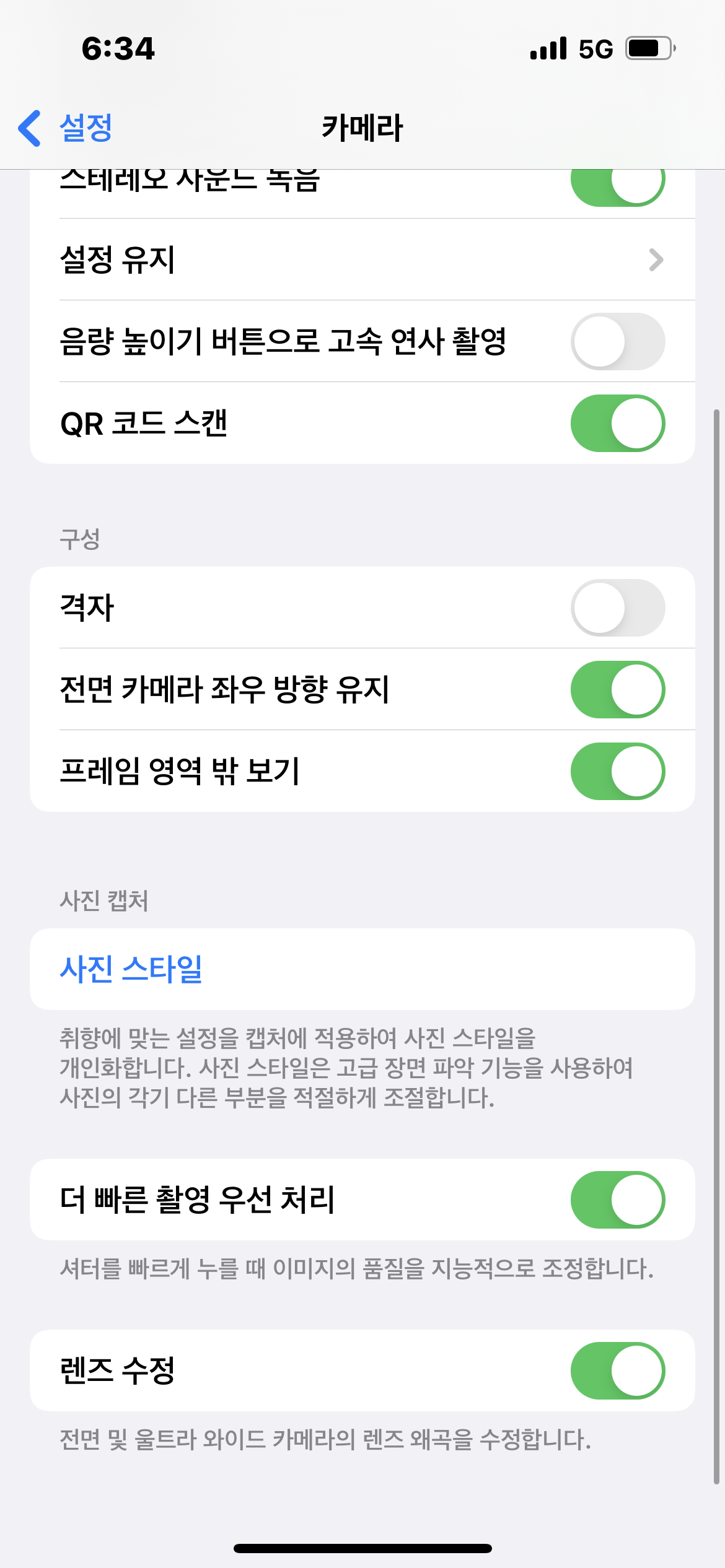 설정 > 카메라 > HDR을 끄고 테스트 해보시기 바랍니다.