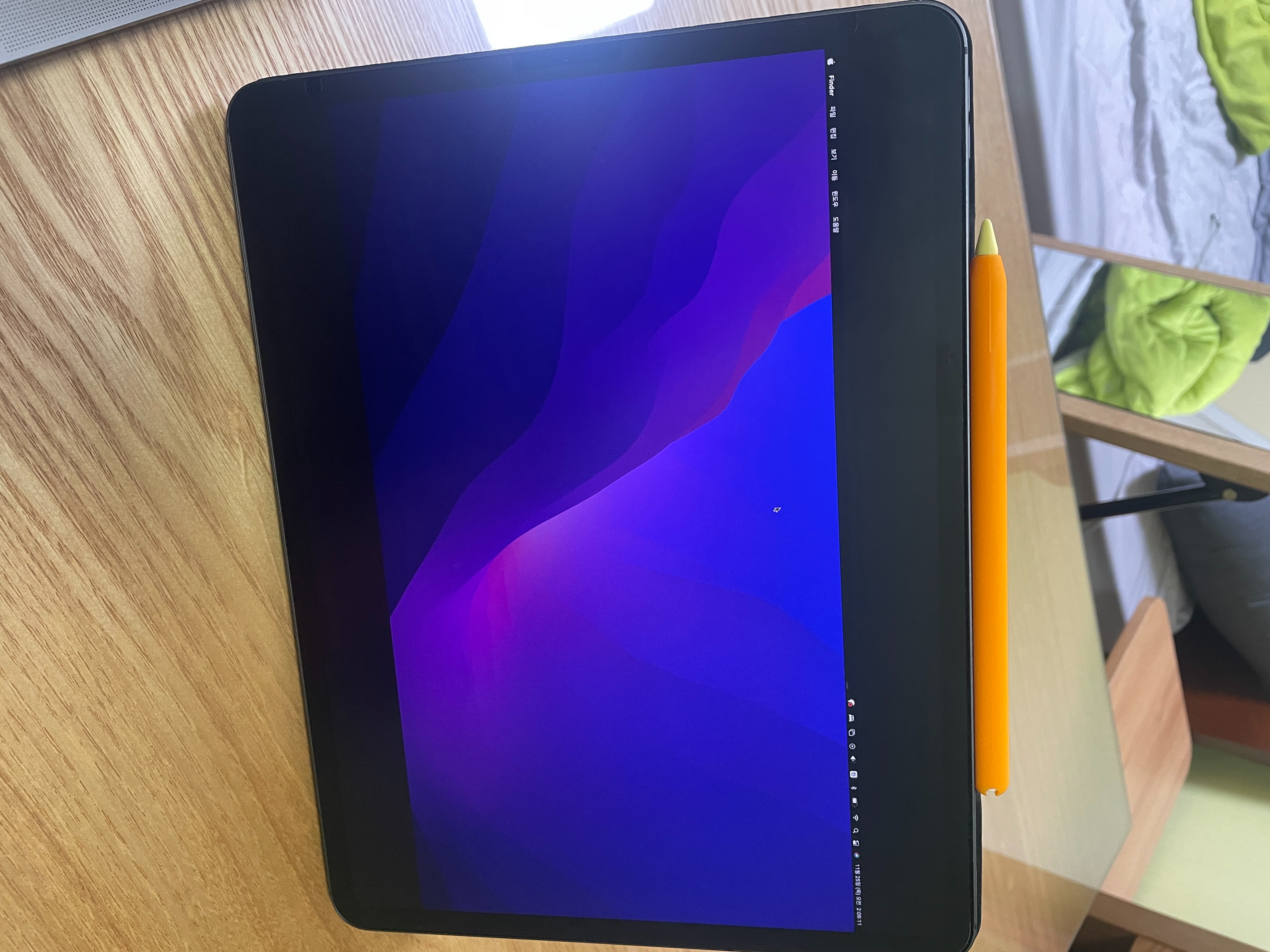 위 사진에서 왼쪽 디스플레이가 맥북이고 오른쪽 디스플레이가 아이패드입니다.
