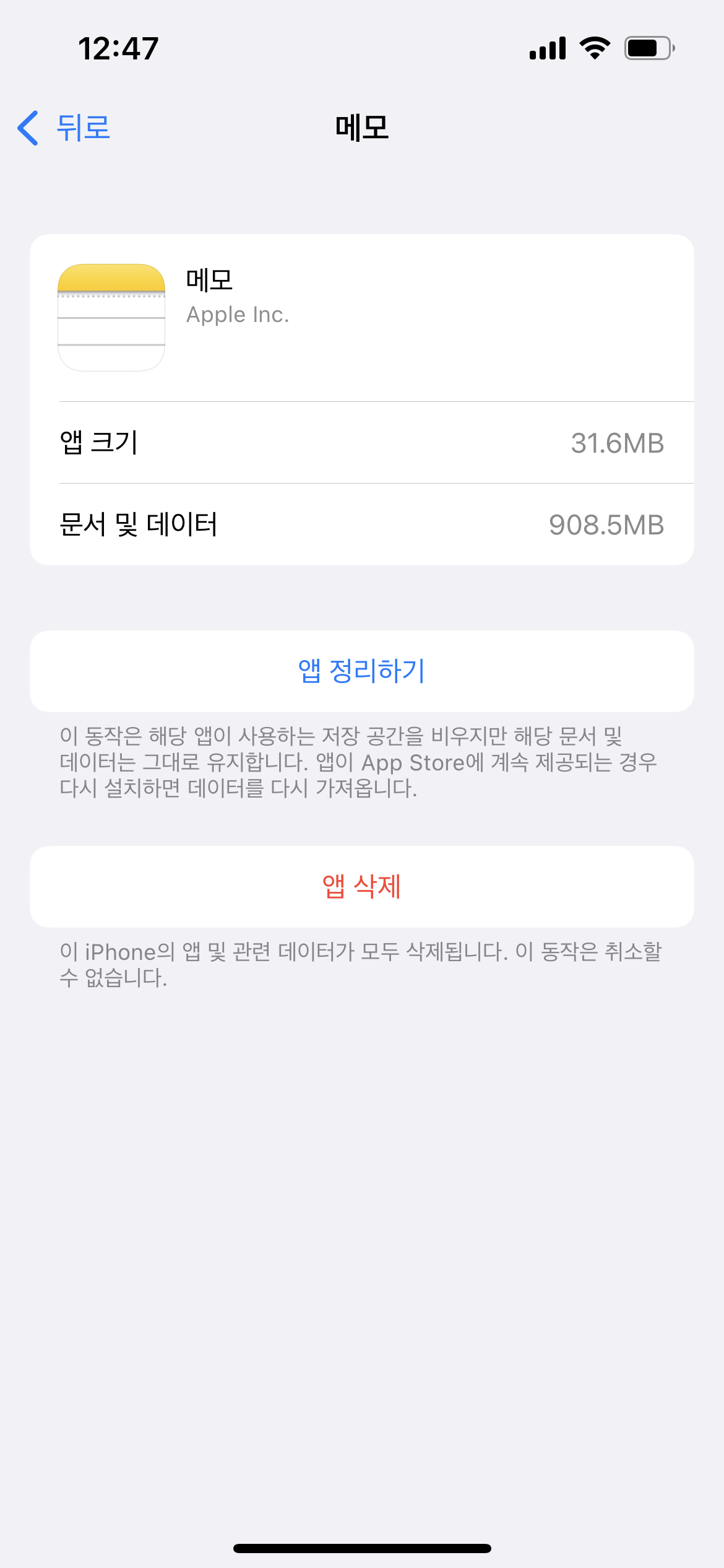이전에 파일 첨부된 메모 때문인 것 같은데, 메모 이미 삭제했고 아이클라우드 홈페이지 들어가도 삭제한 용량 큰 메모는 안 뜨던데 왜 계속 메모 어플 용량이 저 모양이죠...?