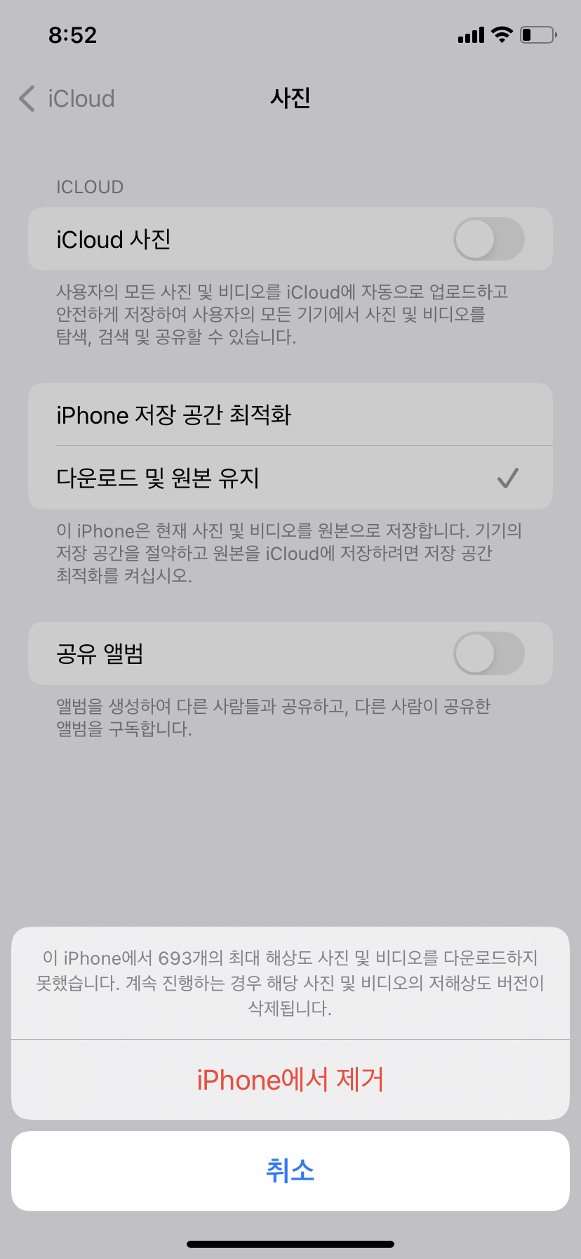 iCloud 저장 공간 요금제 다운그레이드 전 사진 보관함을 끄고자 하셨으나 다음 메시지가 확인되어 문의주셨습니다.