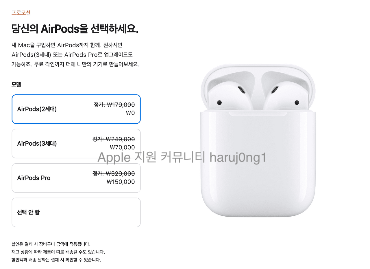AirPods 제공, AppleCare+ 20% 할인 혜택을 받을 수 있는 프로모션입니다.