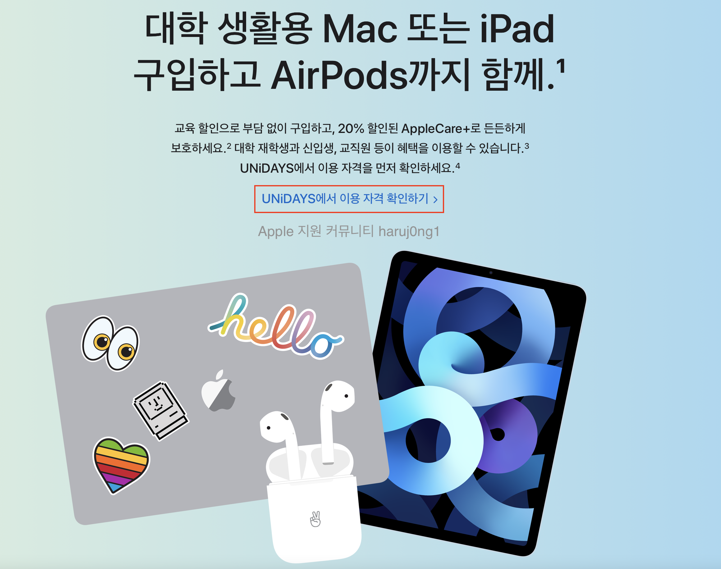 *제외된 제품 같은 경우 교육 할인가를 통해 구입은 가능하나 AirPods 제공 프로모션과 AppleCare+ 20% 할인 혜택이 제외됩니다.