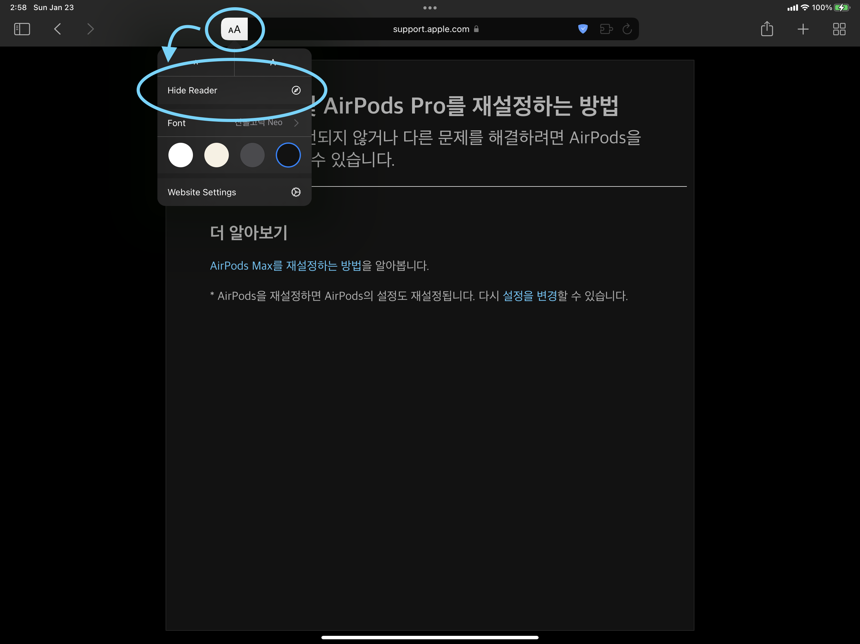 아래 사진을 참고하여 읽기 도구를 비활성화 하실 수 있습니다.