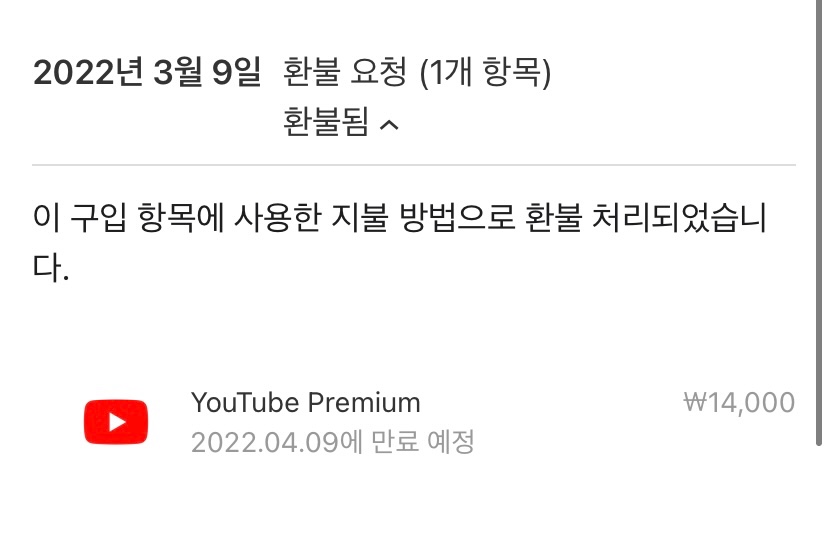 3월 9일에 유튜브프리미엄을 잘못 결제하여 바로 취소요청했고 3월 10일에 환불됨이라고 나오는데 결제취소가 아직 이루어지지 않아서 문의드립니다다.