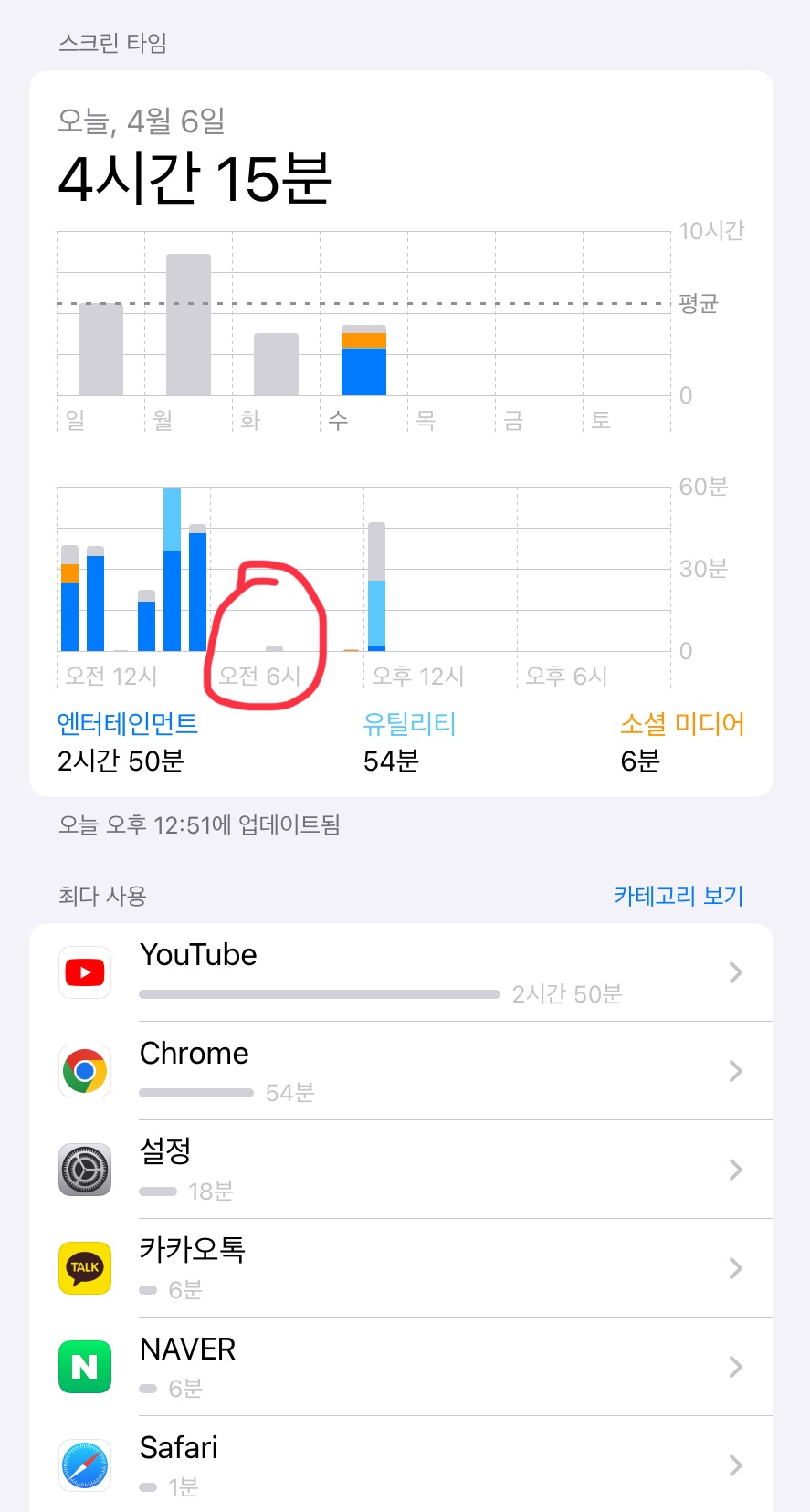 그래서 밑에 최다 사용 앱을 하나하나 눌러봤는데 그 어떤 앱도 저 시간에 사용기록이 없더군요.