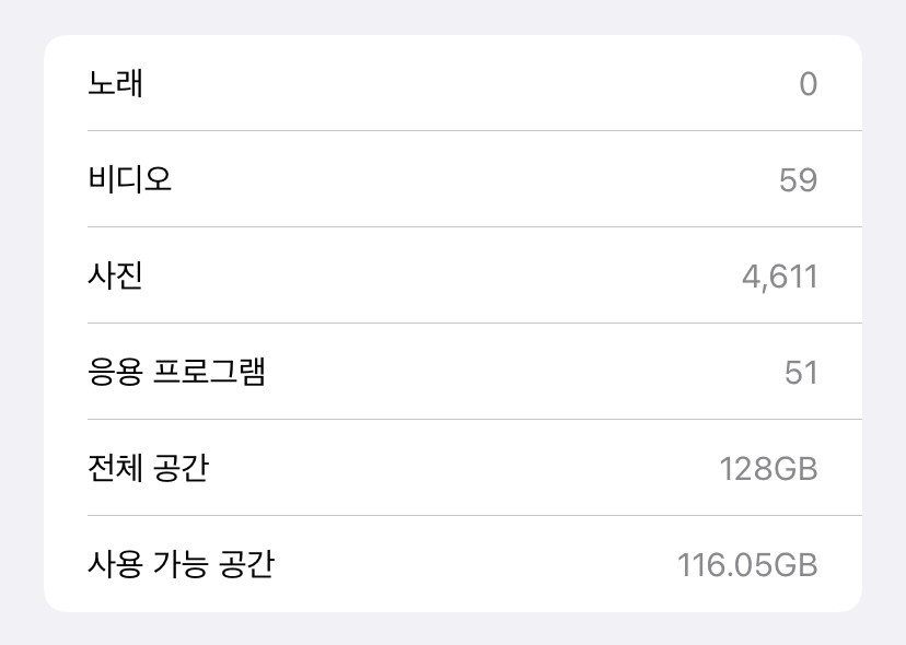 이 사진을 보시면 128G가 중 116G가 사용 가능 공간인 것이 보이실 것입니다. 비디오가 59개, 사진이 4611개, 프로그램이 51개 인데 말입니다!!!!!