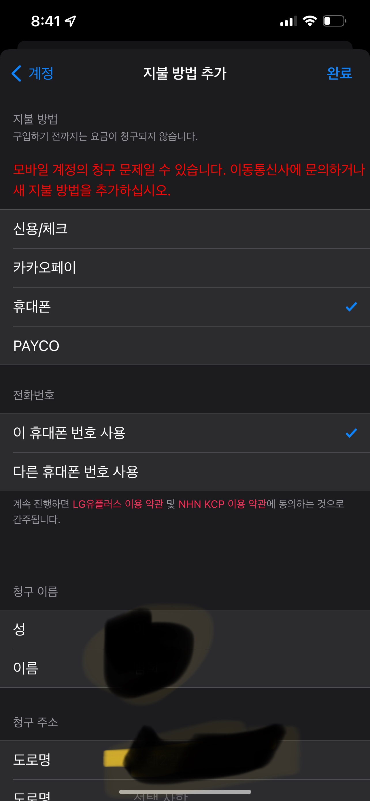 애플 아이디의 휴대폰 결제를 등록하려고 하나 오류가 발생한 문제가 있으시군요.