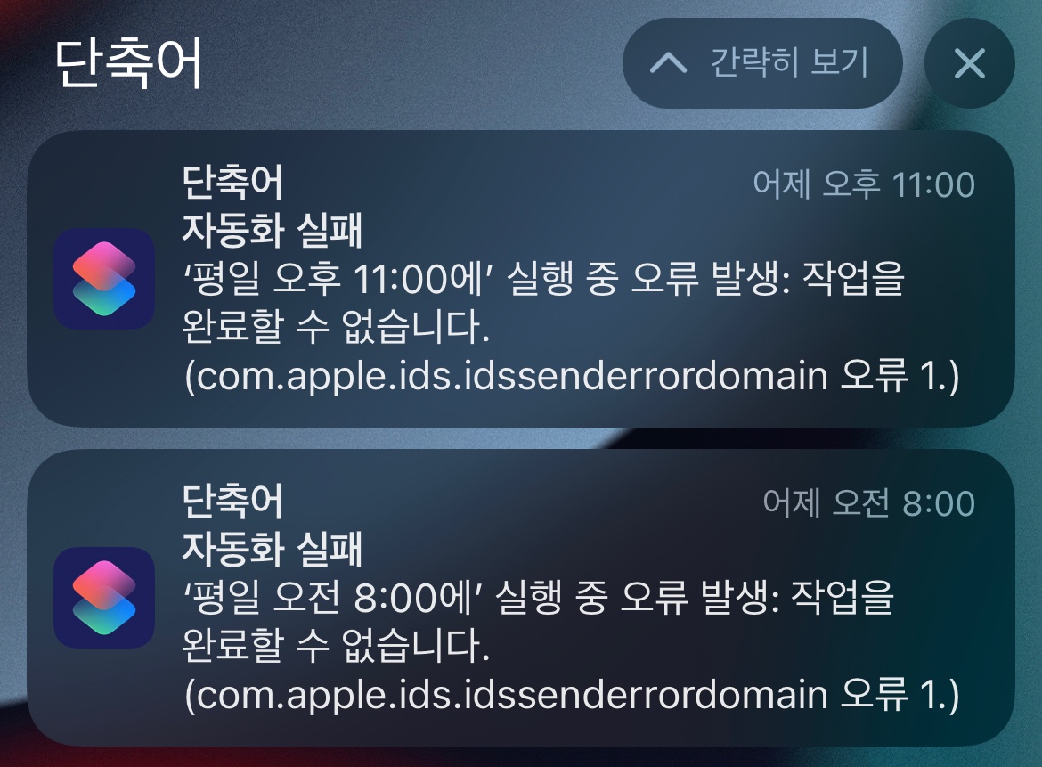 iPhone에서 Apple Watch에 대한 자동화를 설정하였으나, 다음과 같은 오류 알림을 띄우며 실행되지 않습니다.