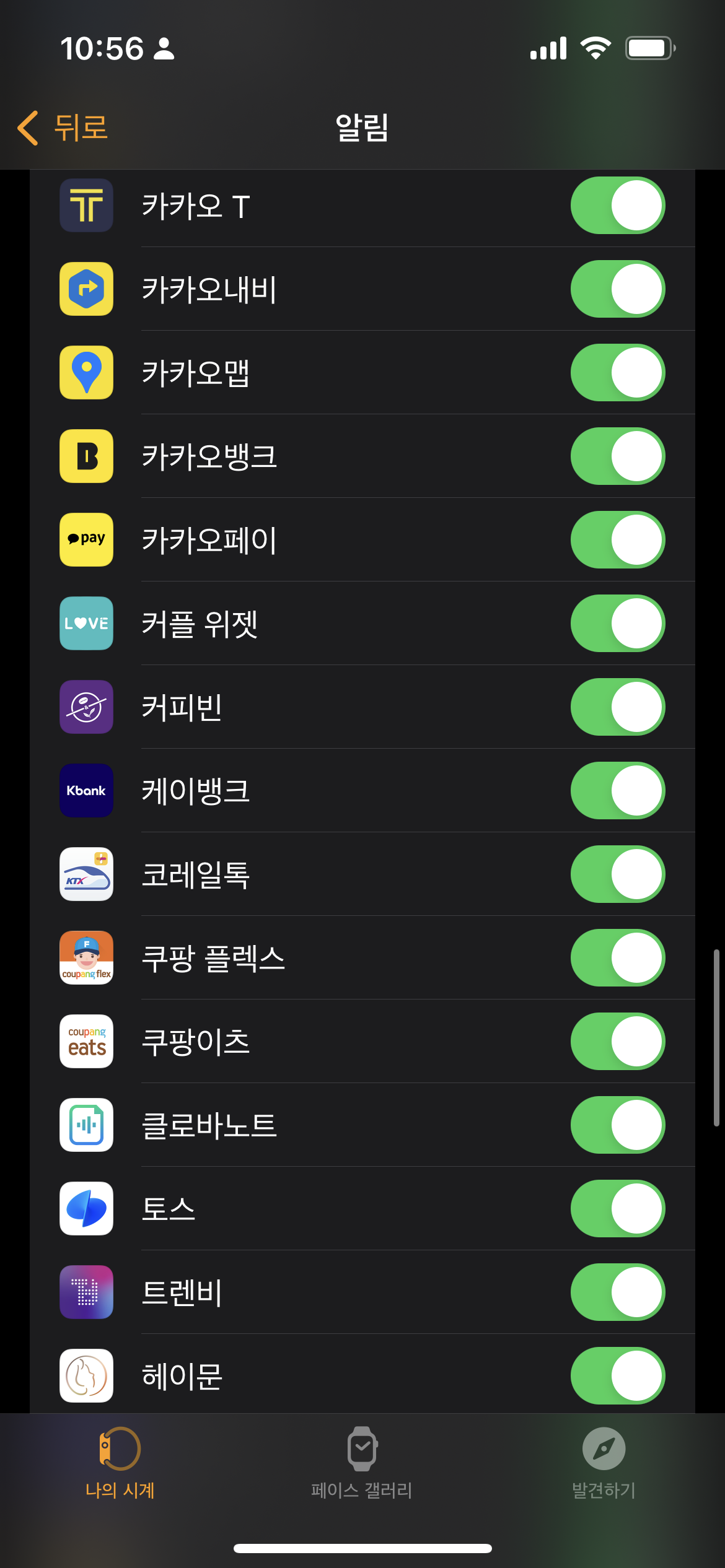 하기 사진과 같이 아이폰 내의 애플워치 앱에서 알림 안에 카카오톡 자체가 없어 미러링이 되지 않습니다.