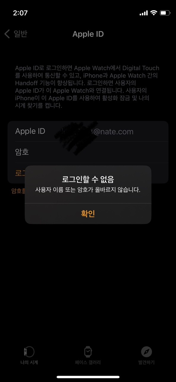 애플 워치에 로그인을 하려고 하시나 사용자 이름 또는 암호가 올바르지 않다고 나오는 상황이시군요.