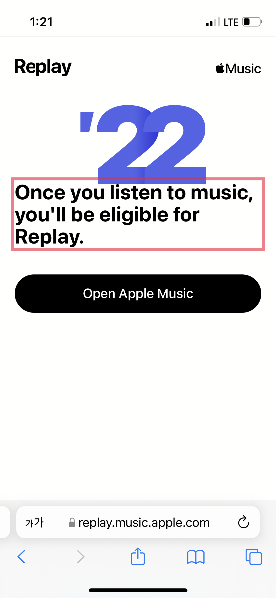 2022 애플뮤직 리플레이 집계가 되지 않습니다. 2017년부터 애플뮤직 이용 중이며 2019년부터 이 서비스를 이용하려고 하면 아무것도 듣지 않아 할 수 없다는 메세지만 뜹니다. 해결 방법이 있을까요?