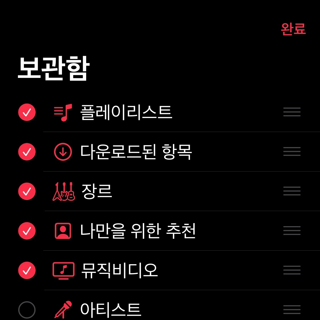 애플뮤직 보관함에 장르, 다운로드 된 항목 , 뮤직비디오 등의 리스트 버튼이 사라져요.. 편집에서 체크를 해도 완료를 누르면 다시 플레이리스트만 뜹니다