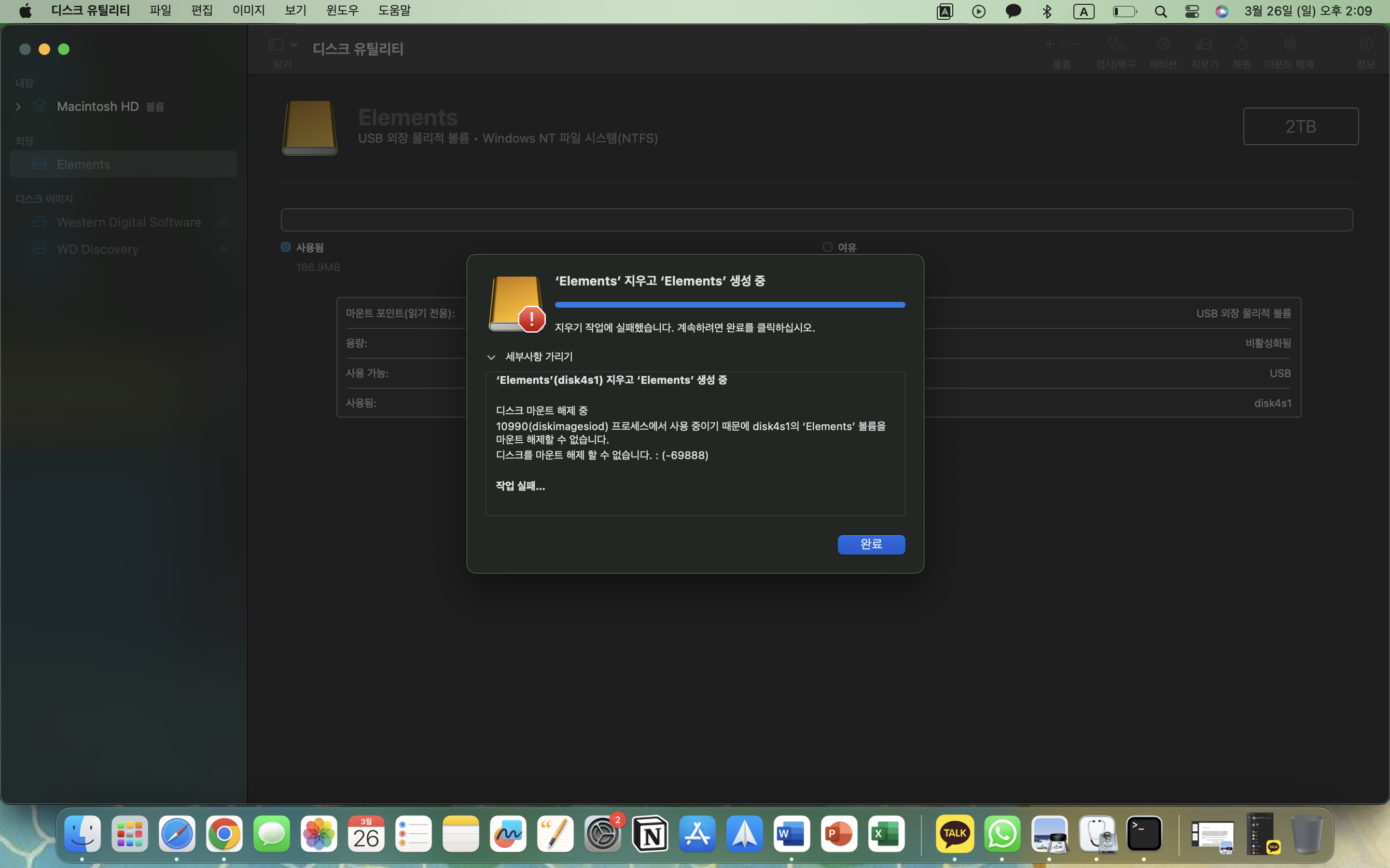WD elements 외장 하드를 맥북에 설치하려는 과정 중, 디스크를 지우기 erase 하라고 해서 계속 시도했는데 하기와 같은 메세지만 받습니다. 제가 어떻게 해야할까요?
